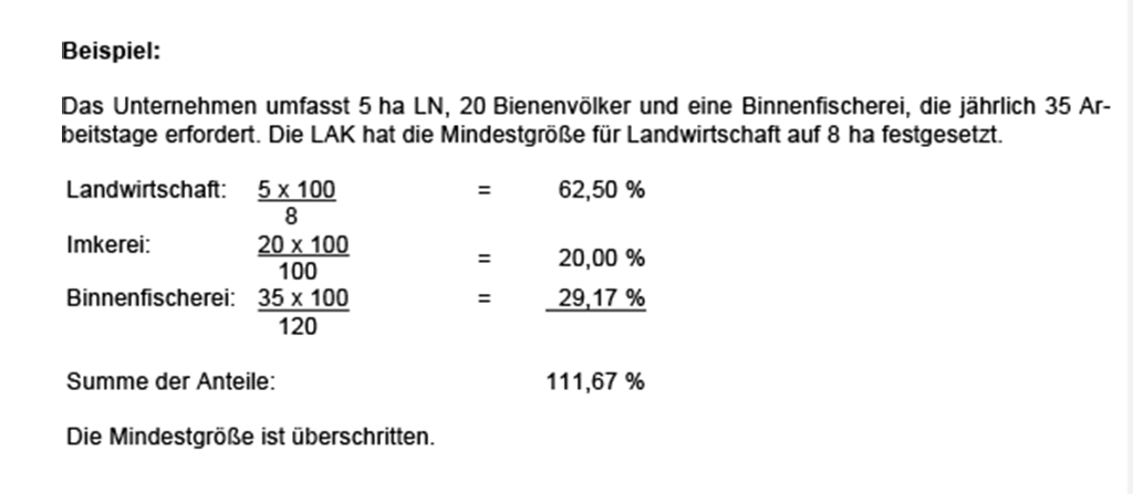(5) 1Ein Unternehmen der Landwirtschaft erreicht dann die Mindestgröße, wenn sein Wirtschaftswert einen von der landwirtschaftlichen Alterskasse unter Berücksichtigung der örtlichen oder regionalen Gegebenheiten festgesetzten Grenzwert erreicht; der Ertragswert für Nebenbetriebe bleibt hierbei unberücksichtigt. 2Ein Unternehmen der Imkerei muss grundsätzlich mindestens 100 Bienenvölker umfassen. 3Ein Unternehmen der Binnenfischerei muss grundsätzlich mindestens 120 Arbeitstage jährlich erfordern. 4Ein Unternehmen der Wanderschäferei muss grundsätzlich eine Herde von mindestens 240 Großtieren umfassen.
