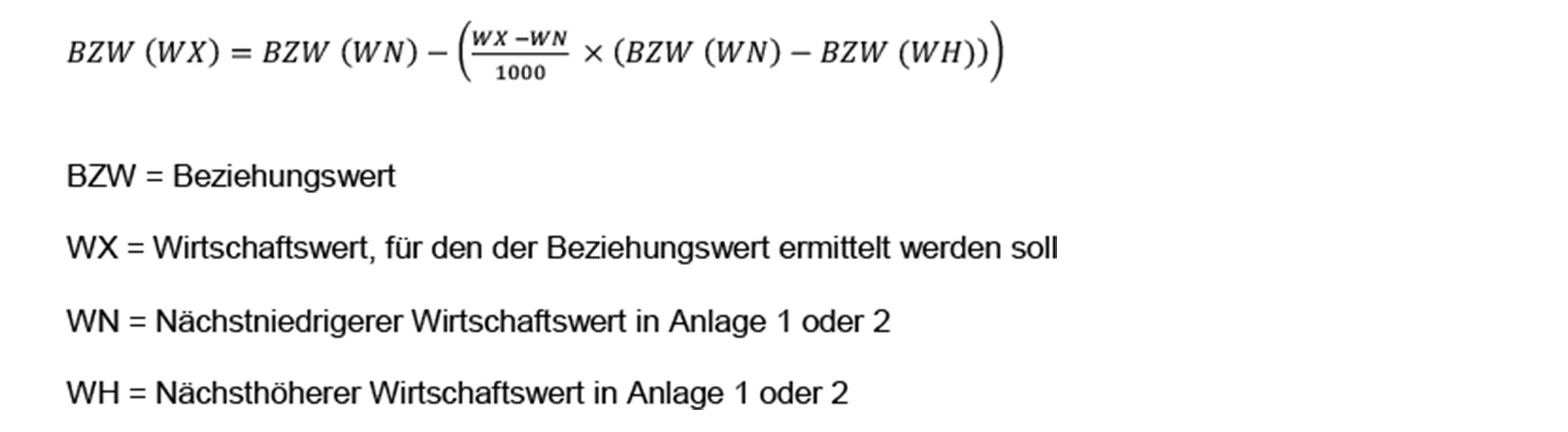 Die Sätze 3 und 4 regeln die Berechnung des Beziehungswerts für Wirtschaftswerte, die geringer sind als der jeweilige Höchstbetrag der Anlagen 1 und 2 und dort nicht aufgeführt sind. Aus Satz 3 ergibt sich folgende Formel: