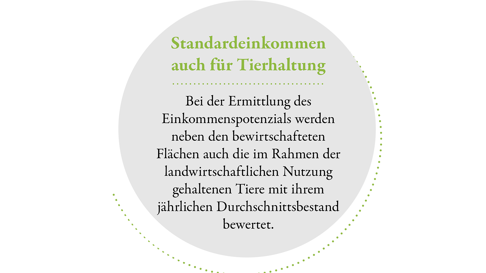 Das Standardeinkommen basiert auf betriebswirtschaftlichen Daten, die das Kuratorium für Technik und Bauwesen in der Landwirtschaft (KTBL) sowie das Thünen-Institut (TI) grundsätzlich in Anlehnung an die bekannten Standarddeckungsbeiträge jährlich zur Verfügung stellen. Betriebswirtschaftliche Daten des Zentrums für Betriebswirtschaft im Gartenbau (ZBG) werden berücksichtigt. Jeder im Kataster der SVLFG erfassten Katasterart – einschließlich der nicht gewerblichen Tierhaltungen – wird im Ergebnis für alle Landkreise ein auf betriebswirtschaftlicher Basis aus dem Durchschnitt der letzten drei Wirtschaftsjahre (bei Forst zehn Jahre) ermittelter Standardeinkommenswert zugeordnet. Abzüge für betriebliche Aufwendungen, zum Beispiel Personalkosten und Abschreibungen, werden bei der Wertermittlung auf Landkreisebene berücksichtigt. Auch negative Einkommenswerte sind möglich.