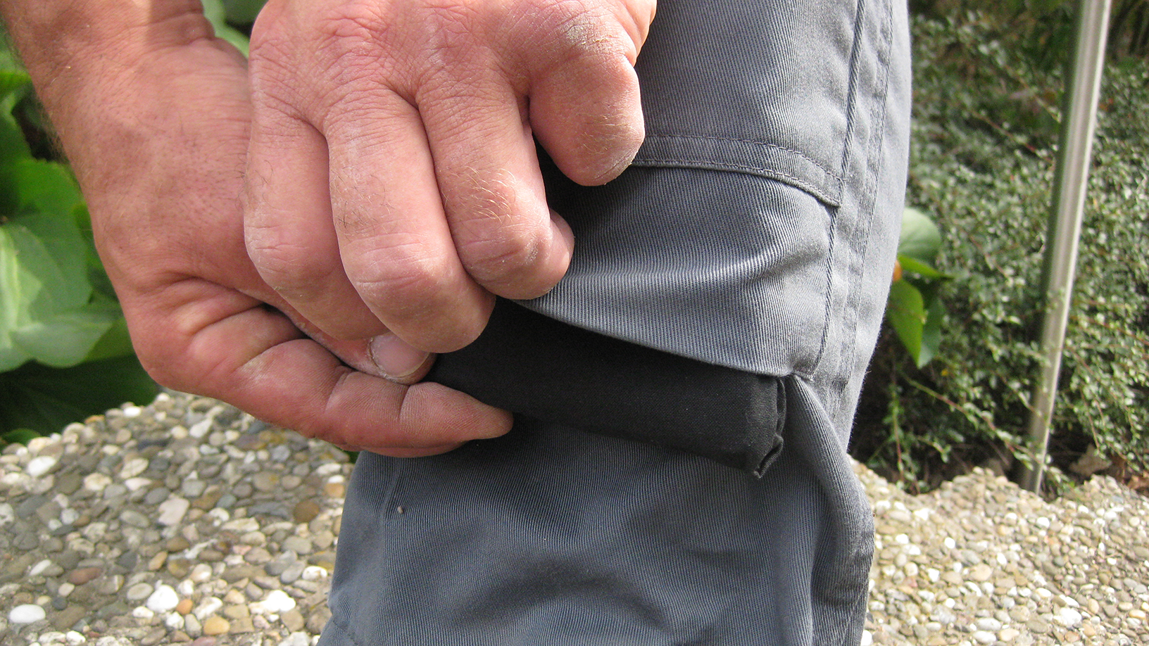 - Knieschutzpolster, die Bestandteil der Hose sind; diese stecken zum Beispiel in Taschen am Hosenbein (Typ zwei)