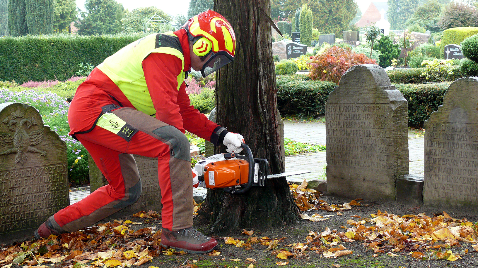 Ein gepflegter Friedhof zeichnet sich auch durch einen gut geplanten und gestalteten Gehölz- und Baumbestand aus. Im Rahmen der Verkehrssicherungspflicht und um die Arbeitsplätze der Mitarbeiter sicher zu gestalten, erfordern insbesondere ältere Anpflanzungen mit Bäumen eine regelmäßige Pflege. Die Arbeitssicherheit hat dabei höchste Priorität.