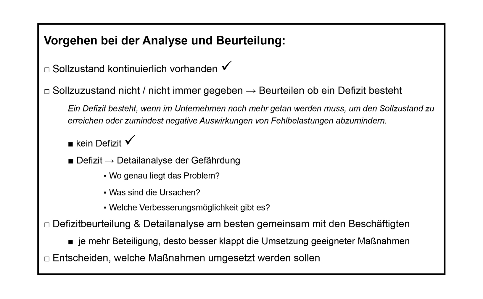 Den Sollzustand erreiche ich am besten, indem ich strukturiert vorgehe und zunächst mögliche Defizite im bestehenden System abkläre. Wenn ein Defizit vorliegt, muss ich die Gefährdungen im Detail untersuchen – am besten gemeinsam mit den Beschäftigten. Dabei werden die konkreten Probleme, deren Ursachen und vorhandene Verbesserungsmöglichkeiten festgestellt.