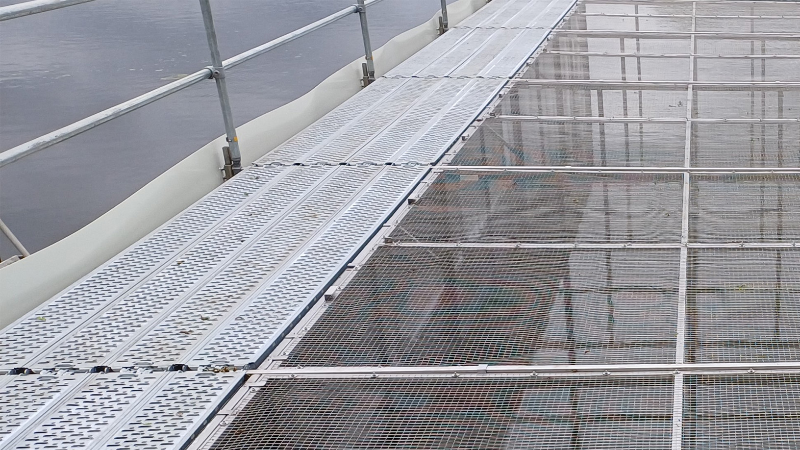 Laufstege und Podeste sind mindestens 0,6 m breit und rutschhemmend ausgelegt. Bereiche, in denen Fahrzeuge direkt bis an den Teich fahren, verfügen über Anfahrsockel ab 0,3 m Höhe. Beim Ablassen von Teichen entfernen Mitarbeitende Staubretter nur mit geeigneten Stangen, Haken oder Zangen.
