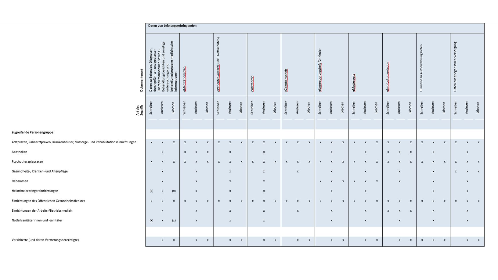 Welche Leistungserbringenden auf welche Daten unter den zuvor genannten Voraussetzungen zugreifen dürfen, ist gesetzlich detailliert geregelt (gemäß § 352 SGB V). Diese Regelungen haben wir für Sie in der folgenden Tabelle 2 zusammengefasst.