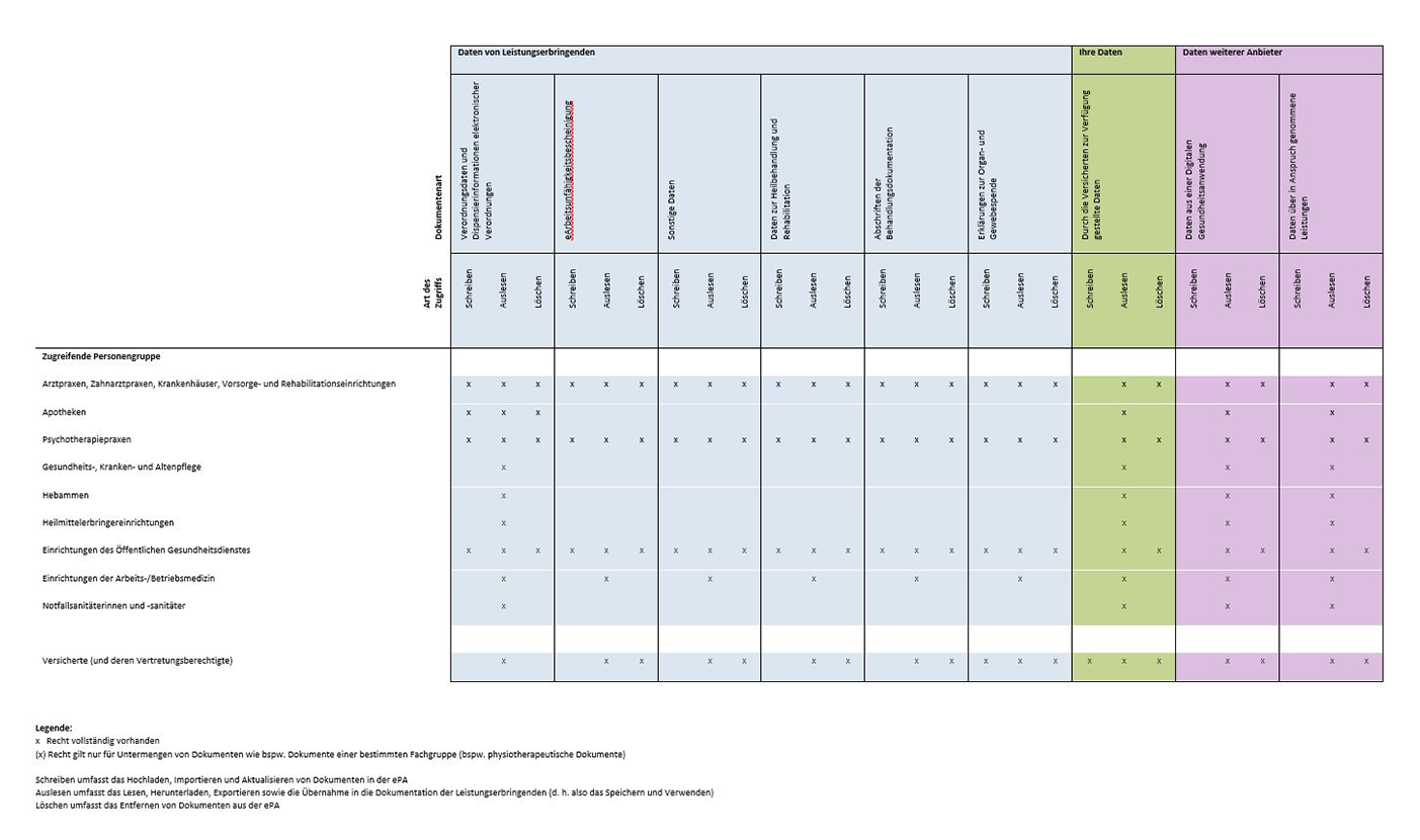 Beispiel 1: Die dargestellte Tabelle zeigt, dass beispielsweise Ärztinnen und Ärzte sowie das Personal in ärztlichen Leistungserbringereinrichtungen – ohne weitere Einschränkungen bei Ihrer Berechtigungsvergabe – auf alle Daten von Leistungserbringenden schreibend, auslesend und löschend zugreifen können.