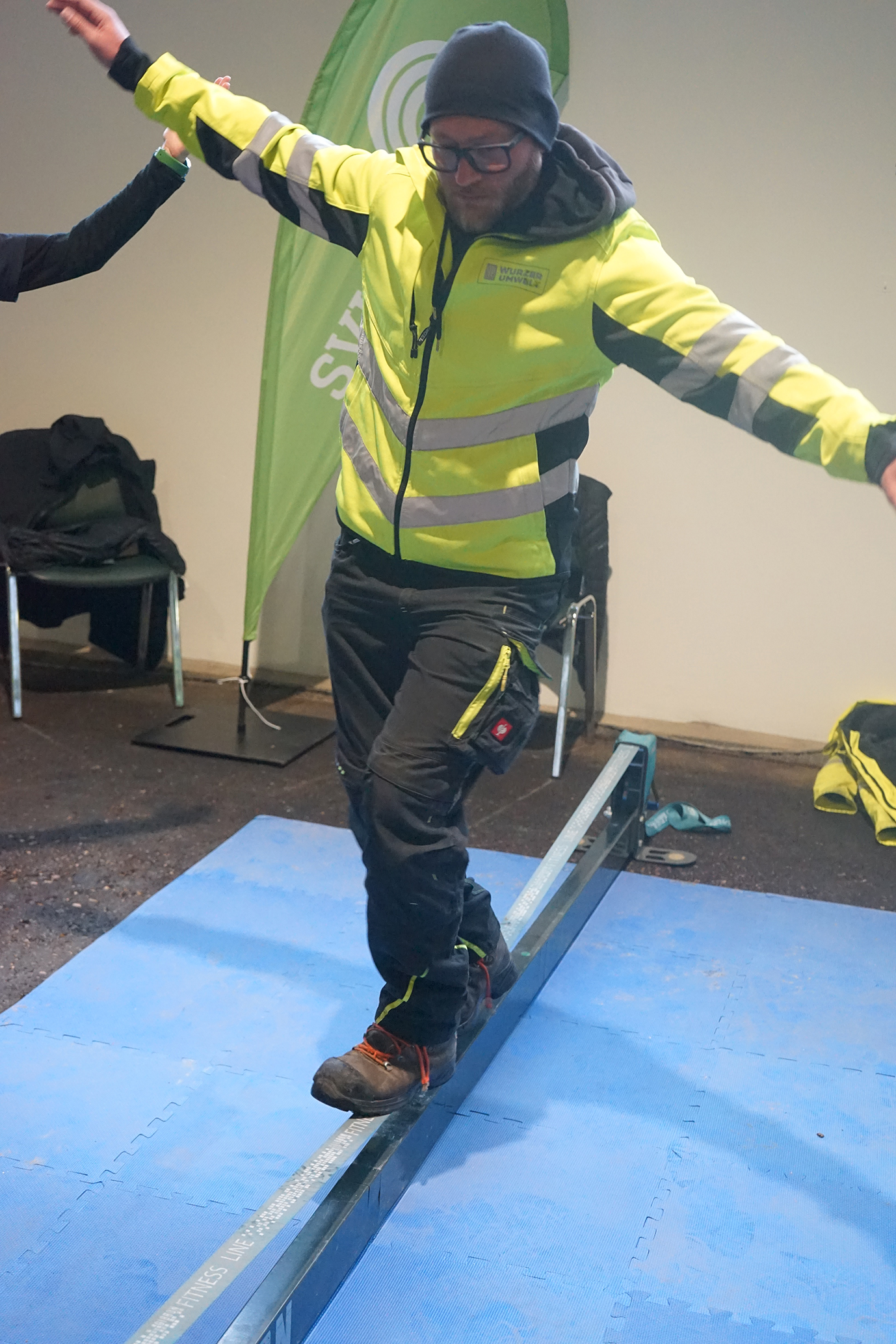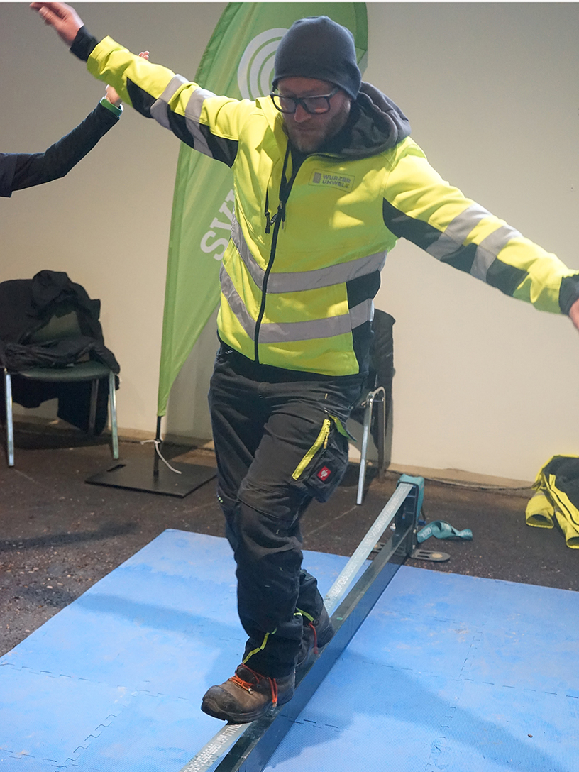 Stolpern, Stürzen und Ausrutschen zählen zu den häufigsten Unfallursachen in der Grünen Branche. Mit einem guten Gleichgewichtssinn sinkt das persönliche Unfallrisiko. Beim Gesundheitstag konnten die Mitarbeitenden auf einer Slackline ihre Balance trainieren. Die Beraterinnen und Berater der SVLFG gaben Tipps für die ersten Schritte auf dem knapp über dem Erdboden gespannten Band. Wurzer-Mitarbeiter Sergej Bergen ließ es sich nicht nehmen, die Slackline auszuprobieren. Sein Eindruck: „Es war spannend. Ein ganz außergewöhnliches Gefühl, auf der Slackline zu erleben, wie man sein Gleichgewicht trainieren kann.“ Wer regelmäßig auf der Slackline balanciert, stabilisiert die Gelenke, verbessert das Gleichgewichtsgefühl, sorgt für eine bessere Körperspannung und verringert somit sein Unfallrisiko.
