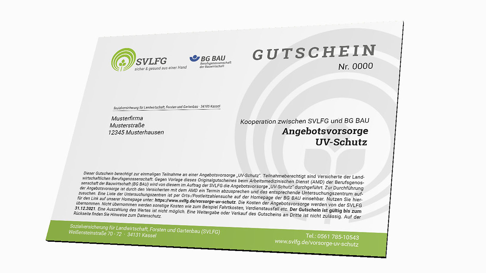 Er nimmt Kontakt zur SVLFG auf, entweder online über www.svlfg.de/vorsorge-uv-schutz oder ruft an unter Telefon 0561 785 -10543. Die SVLFG benötigt dann die Mitgliedsnummer und Adresse. Pro Betrieb können maximal zehn Gutscheine abgerufen werden.