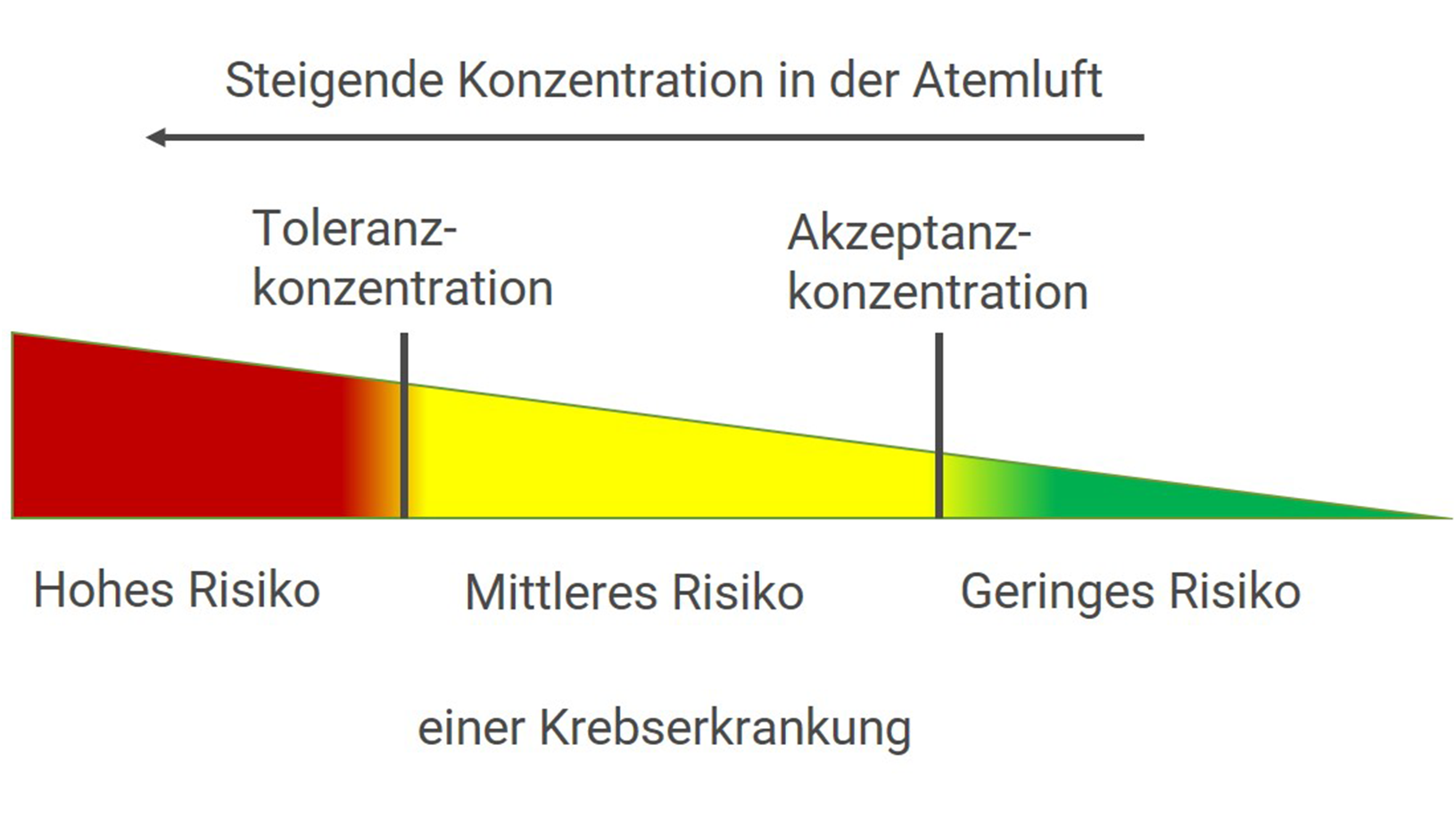 Durch die Änderungen der Gefahrstoffverordnung wird das risikobezogene Maßnahmenkonzept, welches bisher in der Technischen Regel für Gefahrstoffe (TRGS 910) geregelt war, geltendes Recht. Das Konzept betrachtet die Wahrscheinlichkeit einer Krebserkrankung in Anhängigkeit der Exposition mit einem krebserzeugenden Gefahrstoff in der Atemluft über das gesamte Berufsleben. Ausschlaggebend für Schutzmaßnahmen sind somit nicht alleine die gefährlichen Eigenschaften eines Stoffes oder Gemisches, sondern auch die konkret am Arbeitsplatz vorliegende Konzentration desselben. Das Konzept legt jeweils zwei Konzentrationswerte für einen krebserzeugenden Stoff fest: die „Akzeptanzkonzentration“ und die „Toleranzkonzentration“.