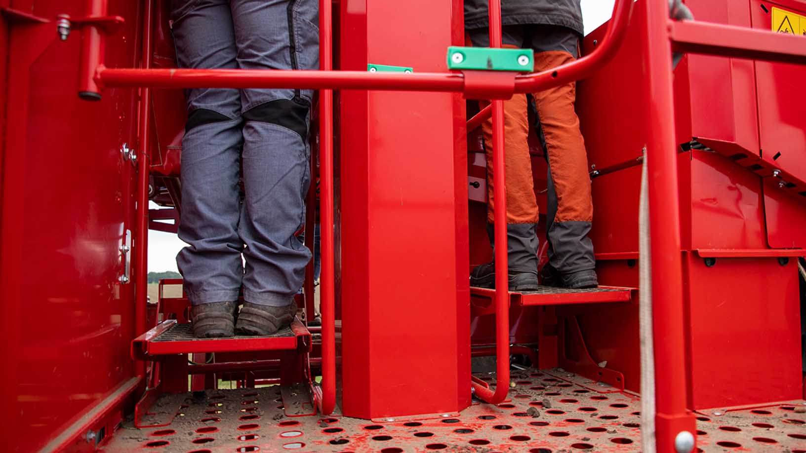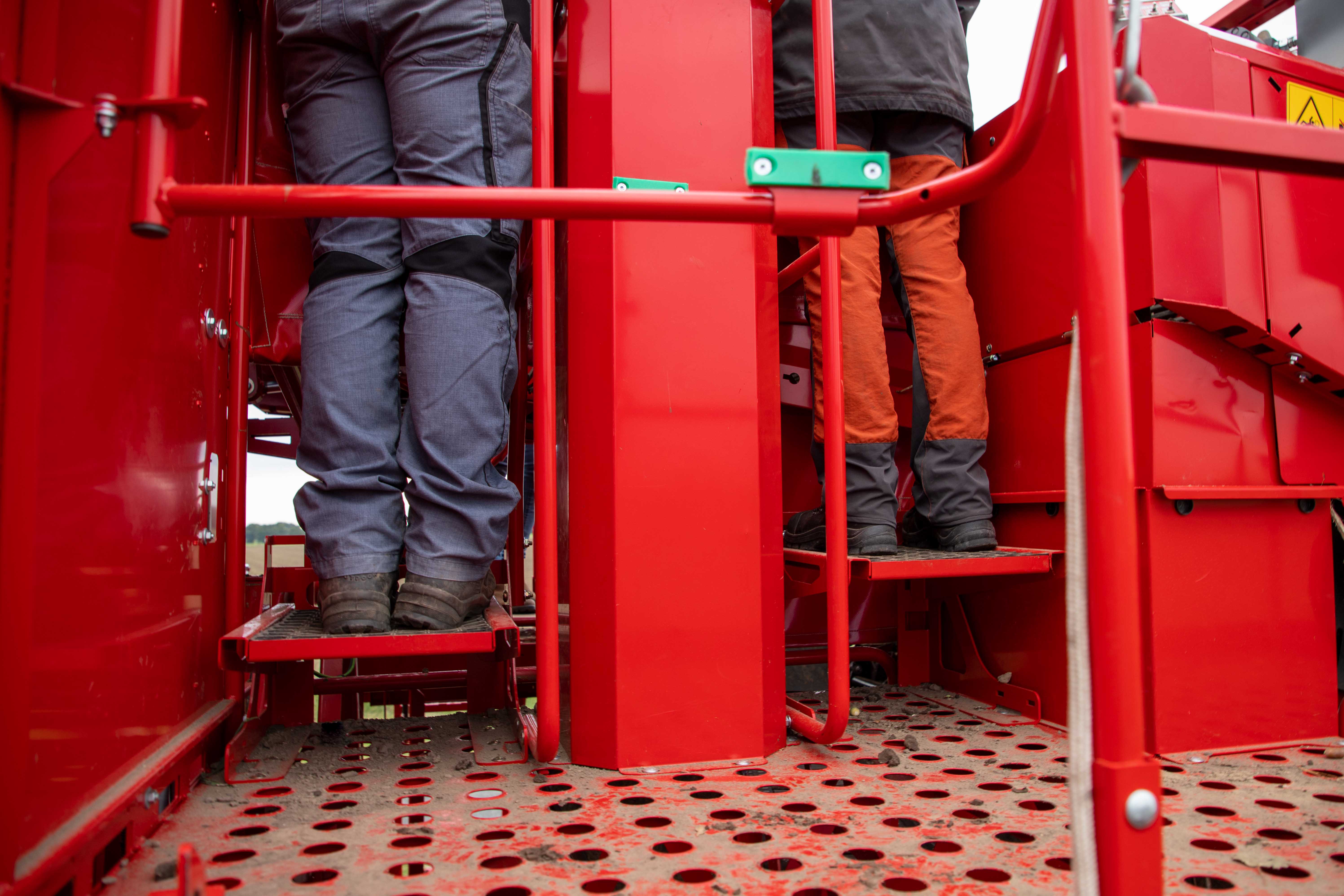 Am Verleseband, sollten sich die Beschäftigten nicht weiter als 60 cm nach vorne oder zu den Seiten beugen müssen, um die Kartoffeln zu greifen (vgl. DGUV Regel 114-602). Ist der Greifraum größer, kann dies zu Rückenbeschwerden führen. Podeste mit Höhenausgleich helfen Menschen mit unterschiedlichen Körpergrößen dabei, am gleichen Band ergonomisch zu arbeiten. Stehhilfen sorgen ebenfalls für eine körperliche Entlastung. Elastische Fußbodenbeläge oder Anti-Ermüdungsmatten mindern die Belastung des Muskel-Skelett-Systems und wirken wärmeisolierend.