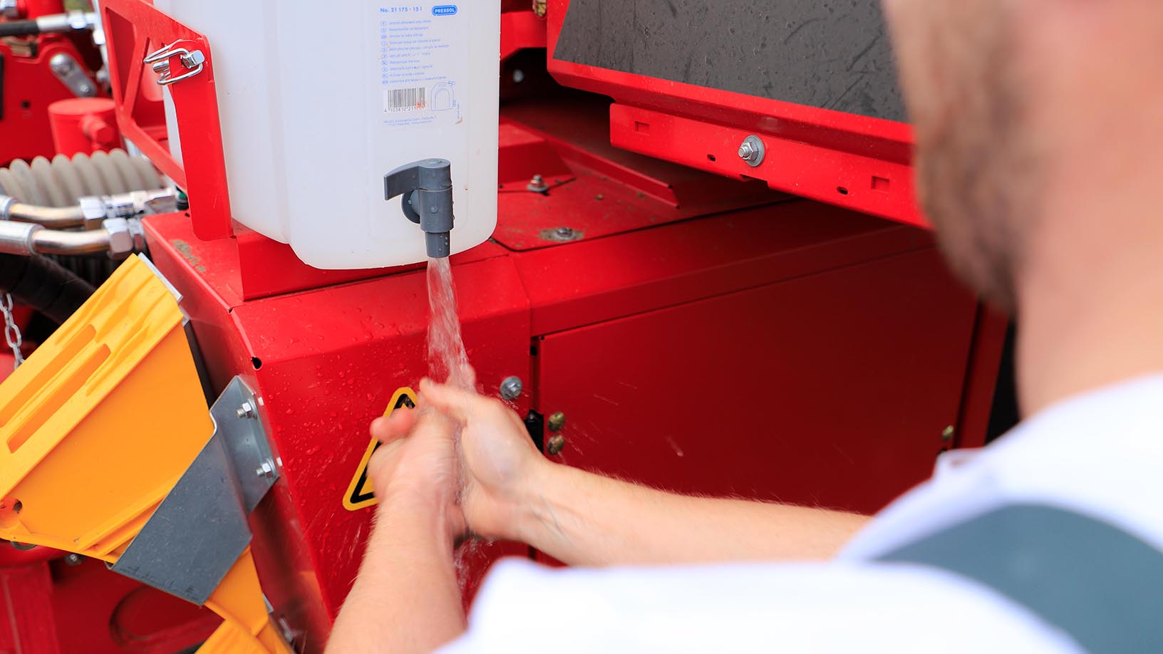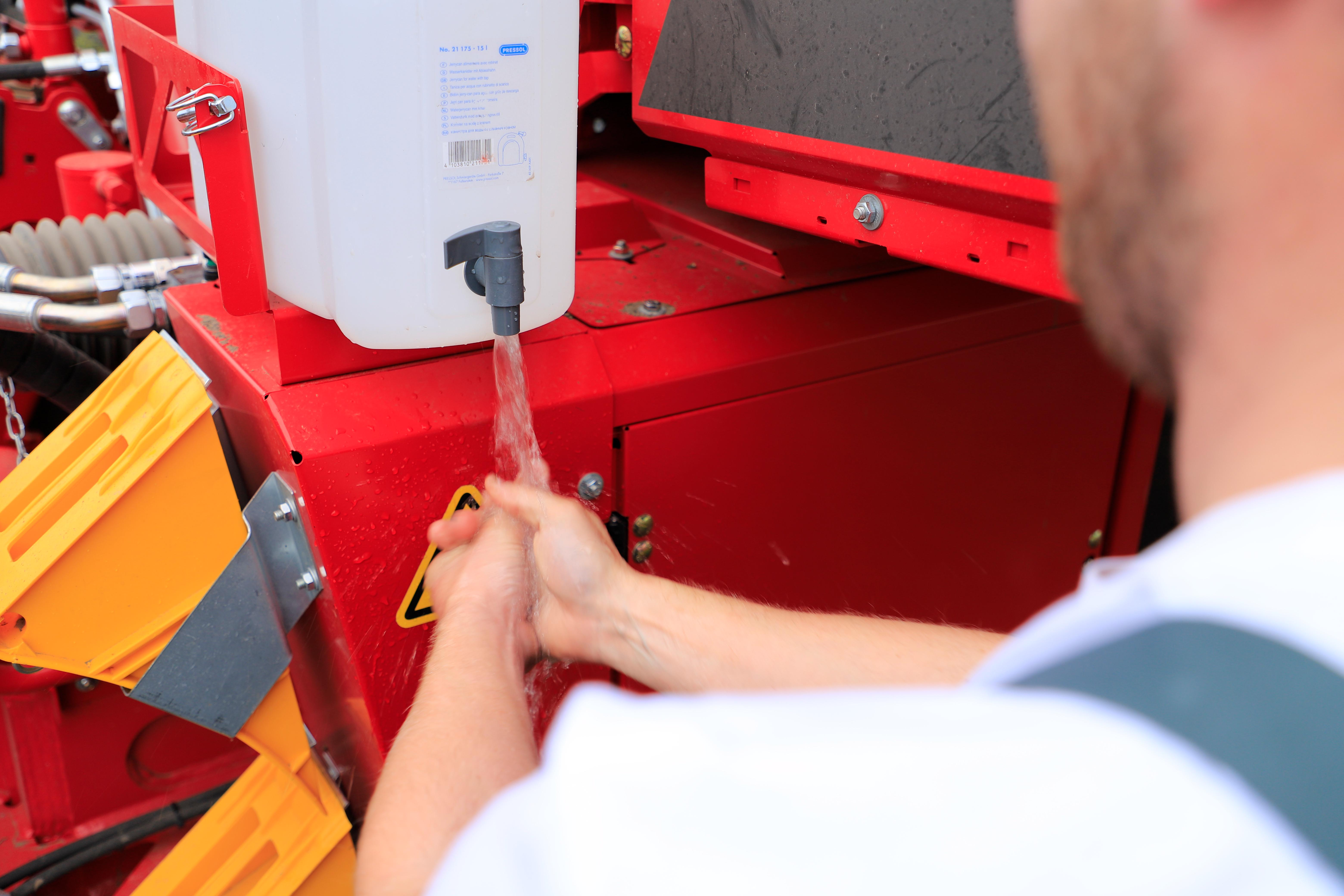 Ein täglich frisch gefüllter Wassertank zum Händewaschen sorgt für Hygiene am Arbeitsplatz. Foto: Grimme