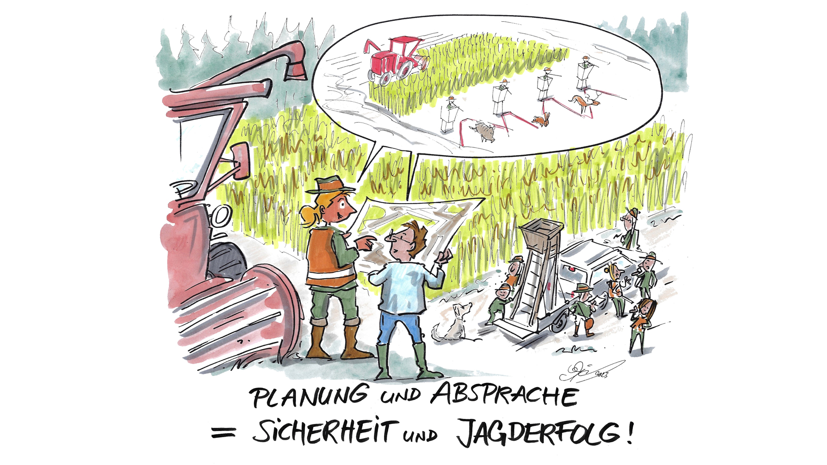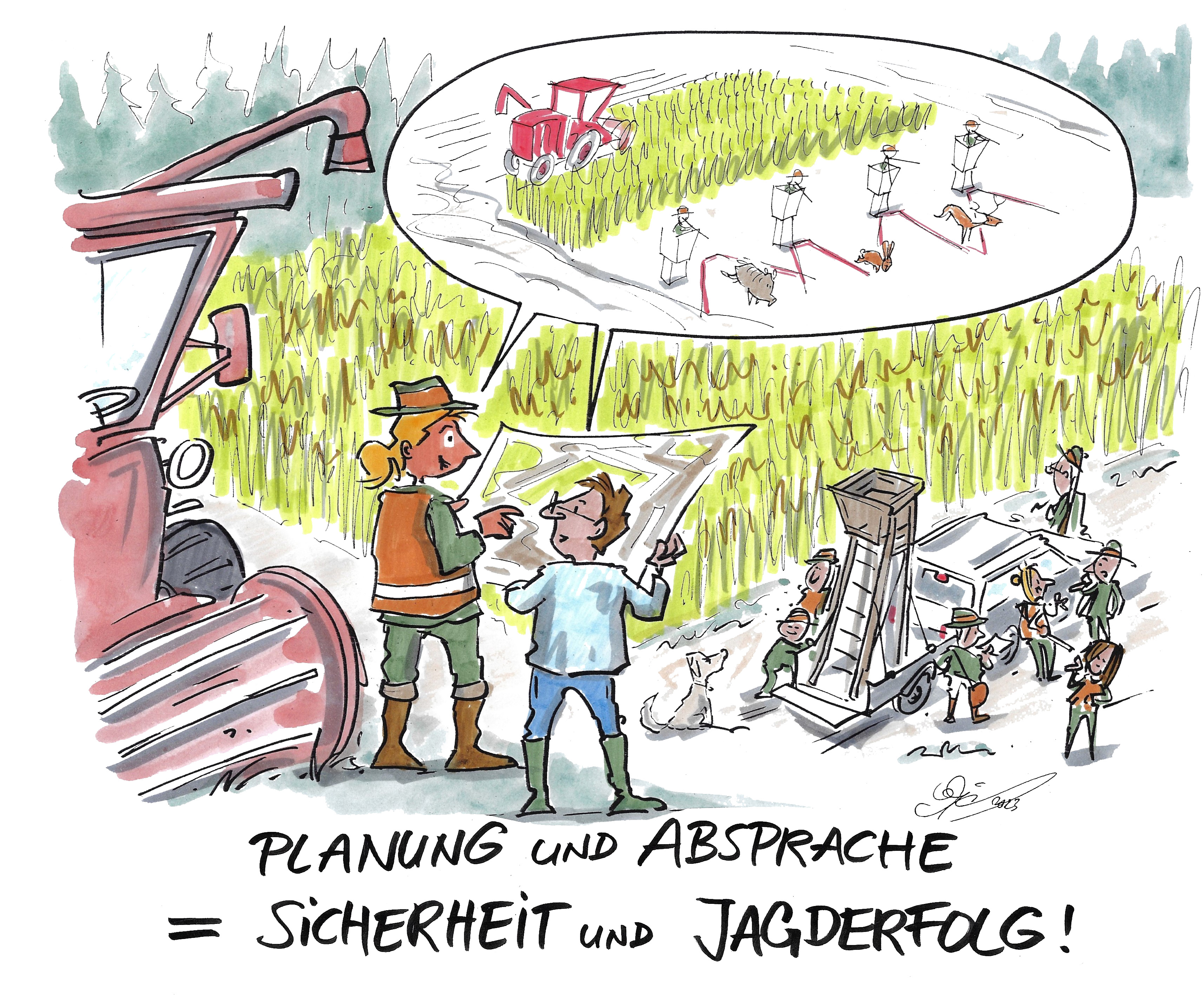 Eine detaillierte Absprache zwischen Jäger und Landwirt bzw. Maschinenführer ist für den Jagderfolg und die Sicherheit entscheidend. Durch eine frühzeitige Kontaktaufnahme können Abläufe gemeinsam besprochen und geplant werden, zum Beispiel wann welche Schläge geerntet werden. Auch die angesetzten Zeiten sind entscheidend – endet die Jagd bei Tageslicht oder in der Dämmerung? Treffpunkt, Schützenstände und ggf. weitere Ausrüstung sind festzulegen und allen mitzuteilen. Zudem kann auch darauf hingewirkt werden, dass in Raps und Mais bereits frühzeitig Schuss- und Gliederungsstreifen vom Landwirt angelegt werden. Bei großen Ernteschlägen hat sich das Anlegen von Durchstichen mit Aufteilen in kleinere Treiben bewährt. Dadurch können die Anzahl der benötigten Schützen und ggf. auch die Schussdistanzen verringert werden, was die Sicherheit weiter erhöht. Der Einsatz mobiler Jagdeinrichtungen ermöglicht hier ein schnelleres Umsetzen zwischen den einzelnen Treiben.