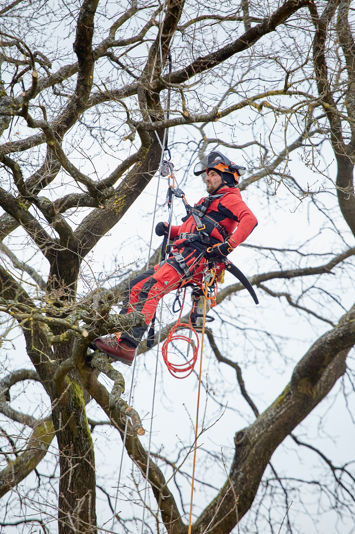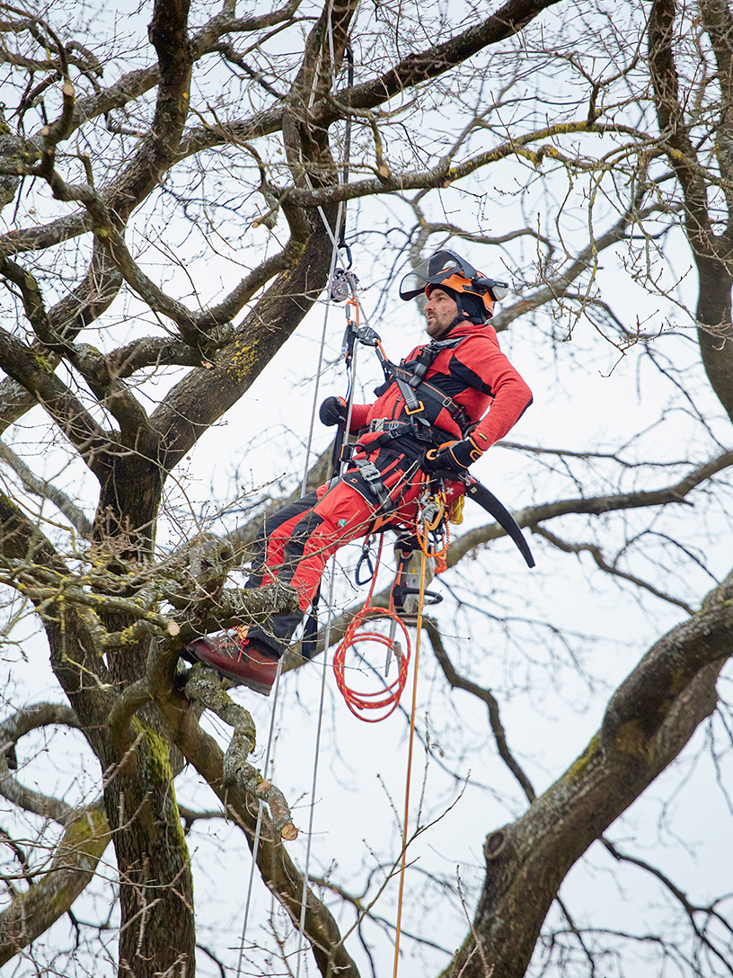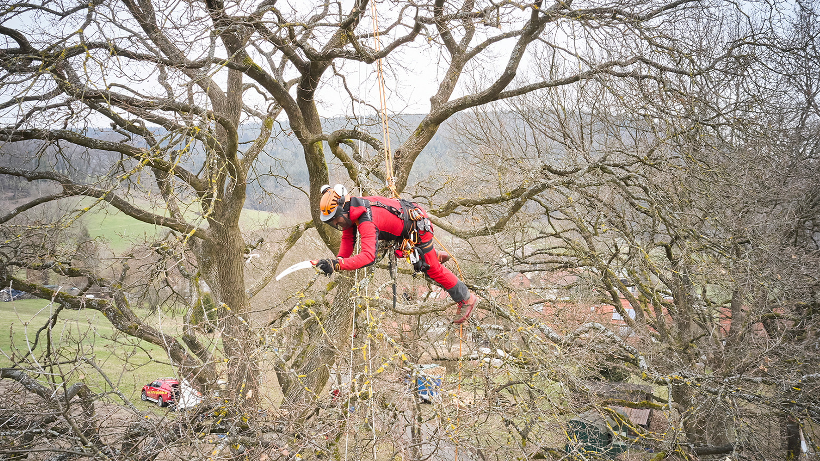 Foto: Mann führt eine seilunterstützte Baumpflege durch