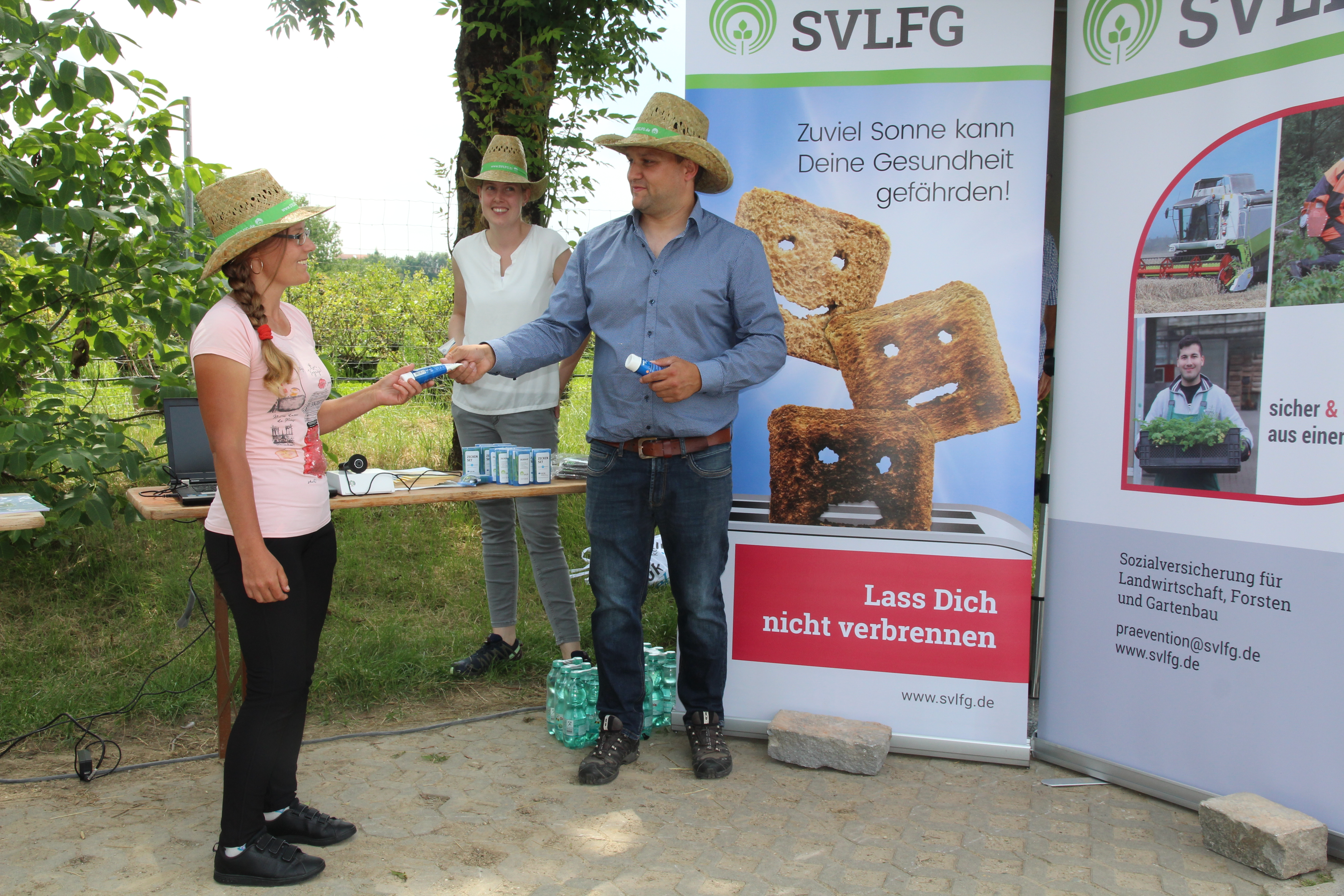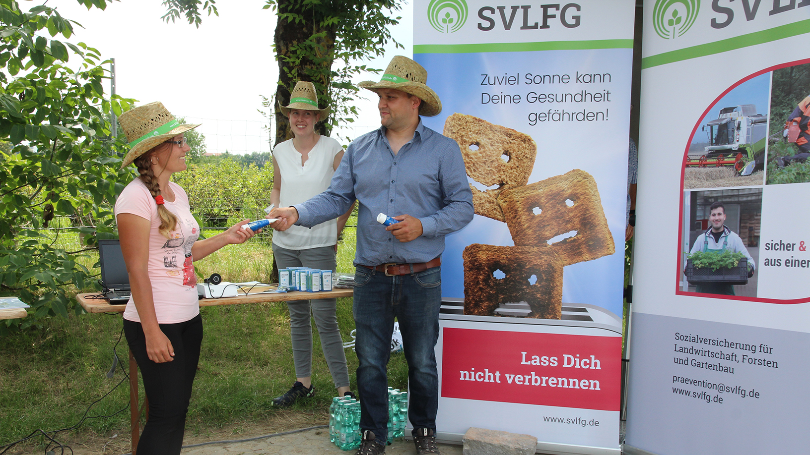 Im Rahmen eines Pressetermins im Unternehmen Apfelböck informierten Reinhold Watzele, SVLFG-Arbeitsbereichsleiter für Gesunde Arbeit, und SVLFG-Präventionsmitarbeiter Meinrad Fußeder über das Gesundheitsrisiko durch zu viel natürliche UV-Strahlung und gaben weitere Tipps zur Vorbeugung von Sonnenbrand. Watzele lobte in diesem Zusammenhang das Engagement der Unternehmer. „Jedes Jahr verzeichnen wir knapp 3000 neue Fälle von weißem Hautkrebs. Hauptursache sind Sonnenbrände, die teils Jahre und Jahrzehnte zurück liegen. Die Haut vergisst nichts. Zum Glück ist der weiße Hautkrebs gut behandelbar, aber besser ist es, der gefährlichen Krankheit vorzubeugen. Sonnenschutz, sowie er auf dem Betrieb Apfelböck gelebt wird, hilft dabei entscheidend mit“, so Watzele. Im Gespräch mit den Saisonarbeitskräften erklärte er noch einmal ausführlich, wie wichtig es ist, möglichst viele Körperpartien bei der Arbeit im Freien mit Kleidung zu bedecken. „Breitkrempige Sonnenhüte spielen dabei eine wichtige Rolle, denn sie beschatten das Gesicht, den Nacken und die Ohren. Bei Sonnencreme empfiehlt Watzele Produkte, die in die Haut einziehen, weil sie nicht kleben. „Beachtet werden muss allerdings, dass diese Cremes rund 20 Minuten benötigen, ehe sie ihre Schutzwirkung entfalten“, so der SVLFG-Mitarbeiter. Wie die Eigenschutzzeit der Haut und der Lichtschutzfaktor der Sonnencreme zusammenspielen erklärte Meinrad Fußeder an einem Beispiel: „ich bin Hauttyp zwei. Meine Haut hat eine Eigenschutzzeit von sechs Minuten. Wenn die Sonnencreme einen Schutzfaktor von 50 hat, heißt dass, ich darf mich damit an diesem Tag 300 Minuten im Freien aufhalten. Danach ist der Schutz erschöpft und Sonnenbrand droht.“ Je höher also der Lichtschutzfaktor und je dunkler der Hauttyp, umso länger ist ein Aufenthalt im Freien möglich, ohne sich einen Sonnenbrand einzuhandeln.