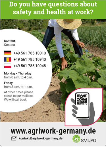 Die SVLFG-Web-App steht unter www.agriwork-germany.de zur Verfügung. Sie kann mit jedem internetfähigen Endgerät erreicht werden. Damit Saisonarbeitskräfte von der Existenz der Informationsplattform Kenntnis erlangen, stellt die SVLFG kostenlos Informationsplakate zum Aushang in den Unterkünften sowie Visitenkarten zur Verfügung. Unternehmer, die sich über die App informieren oder Materialien anfordern möchten, erreichen die SVLFG-Präventionsfachleute telefonisch unter 0561/785 10010 sowie per E-Mail an bgf-koordinierungsstelle@svlfg.de.