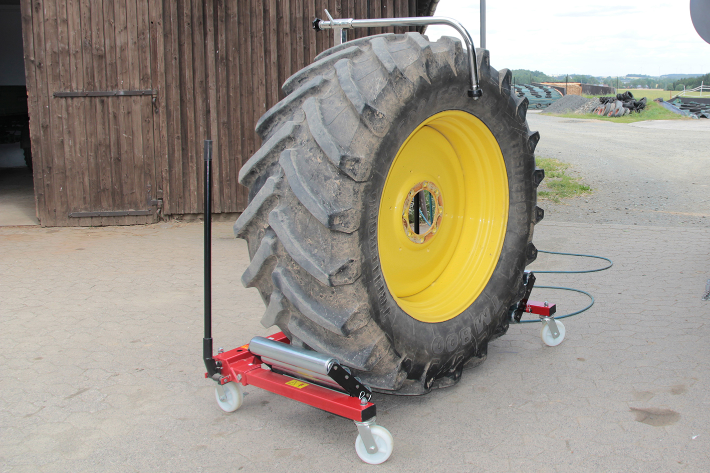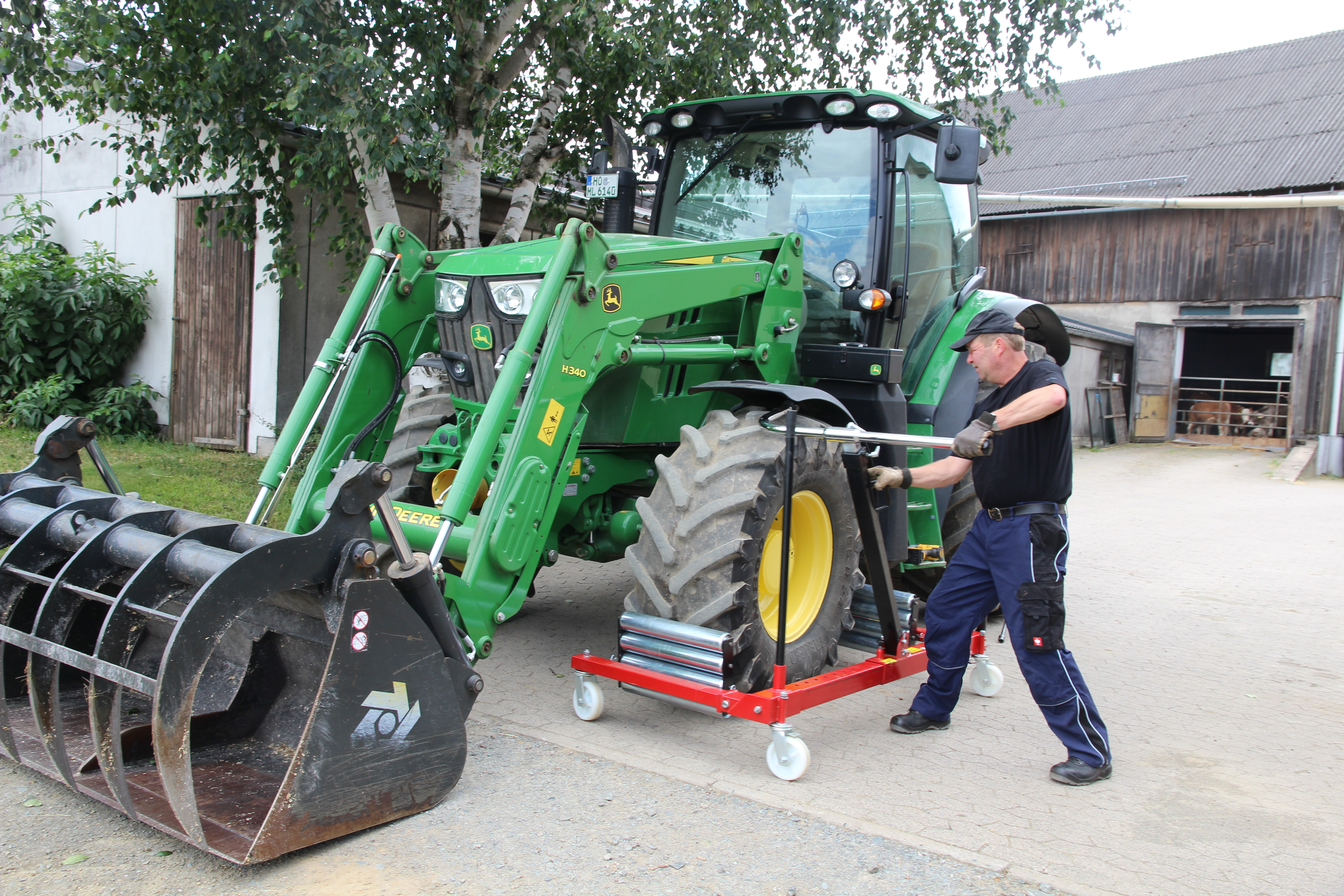 bevor er es am Schlepper befestigt. „Ich bin froh, dass ich den Radwechsel jetzt sicher, schnell und unkompliziert alleine bewerkstelligen kann“, sagt er. Bei Großtraktoren ist der Wechsel von Räder ohne Radwechselwagen nur schwer möglich.