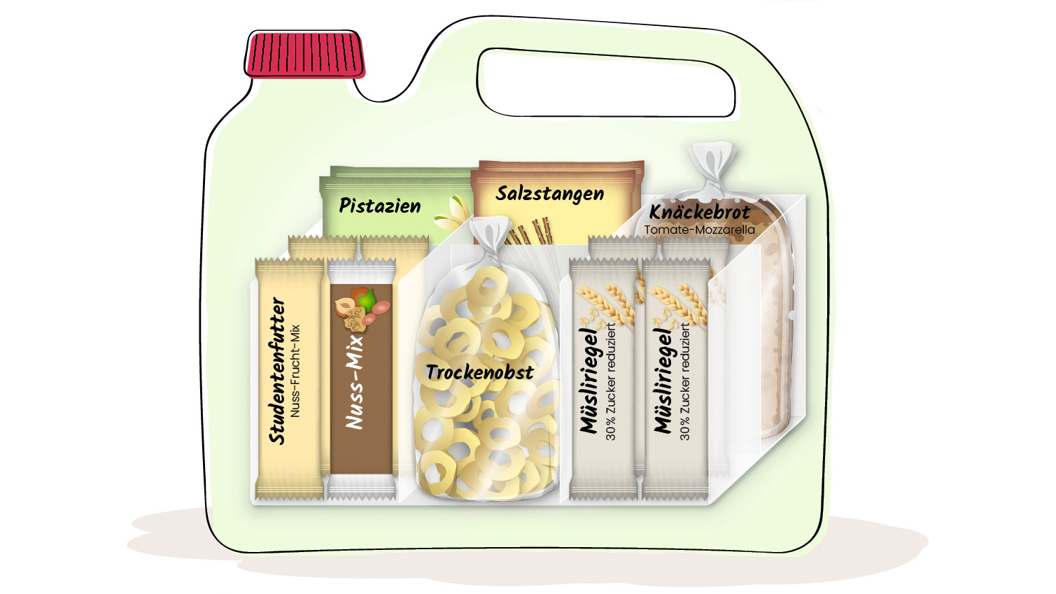 - Für den kleinen Hunger zwischendurch können Sie sich fertige Kräcker kaufen und mit diesen ein Päckchen Kräuterquark „löffeln“. Holen Sie sich noch einen Apfel aus dem Supermarkt.