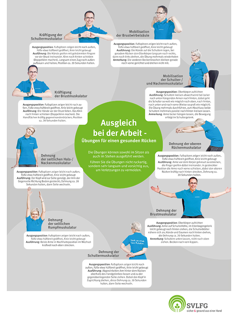 Drucken Sie unser Poster „Rückenstark durch den Arbeitsalltag“ aus und hängen es an Ihrem Arbeitsplatz auf! Wenn Sie täglich in den Pausen üben, tun Sie viel dafür, Rückenschmerzen vorzubeugen.
