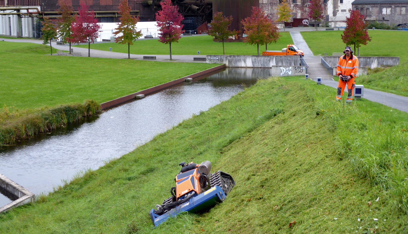 Beim Mähen an Böschungen sind besondere Schutzmaßnahmen erforderlich. Es wird in Schichtlinien, d. h. quer zum Hang, gemäht.