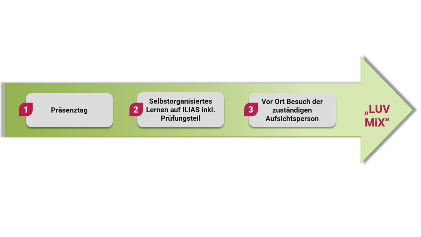 - als LUV MiX-Modell (Blended Learning) mit den drei Bausteinen: Präsenztag, selbstorganisiertes Lernen und einem Vorort-Besuch.