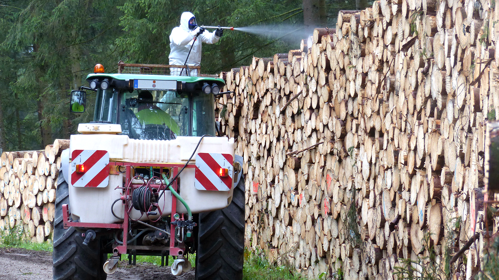 Polterhöhen von über einem Meter senkrechter Absturzhöhe verlangen besondere Maßnahmen gegen Abstürze. Welche dafür geeignet sind, legt die Gefährdungsbeurteilung fest. Besonders das Besteigen von Kurzholzpoltern ist zu unterlassen, denn sie können instabil sein. Wer einen Schlepper in Kombination mit einem Frontlader und einem zugelassenen Arbeitskorb einsetzt, schafft Sicherheit. Zum Schutz des Fahrers vor dem Pflanzenschutzmittel in der Umgebungsluft muss der Schlepper mit einer dicht schließenden Kabine ausgestattet sein. Das Innere der Fahrzeugkabine darf nicht mit dem Pflanzenschutzmittel verschmutzt werden.
