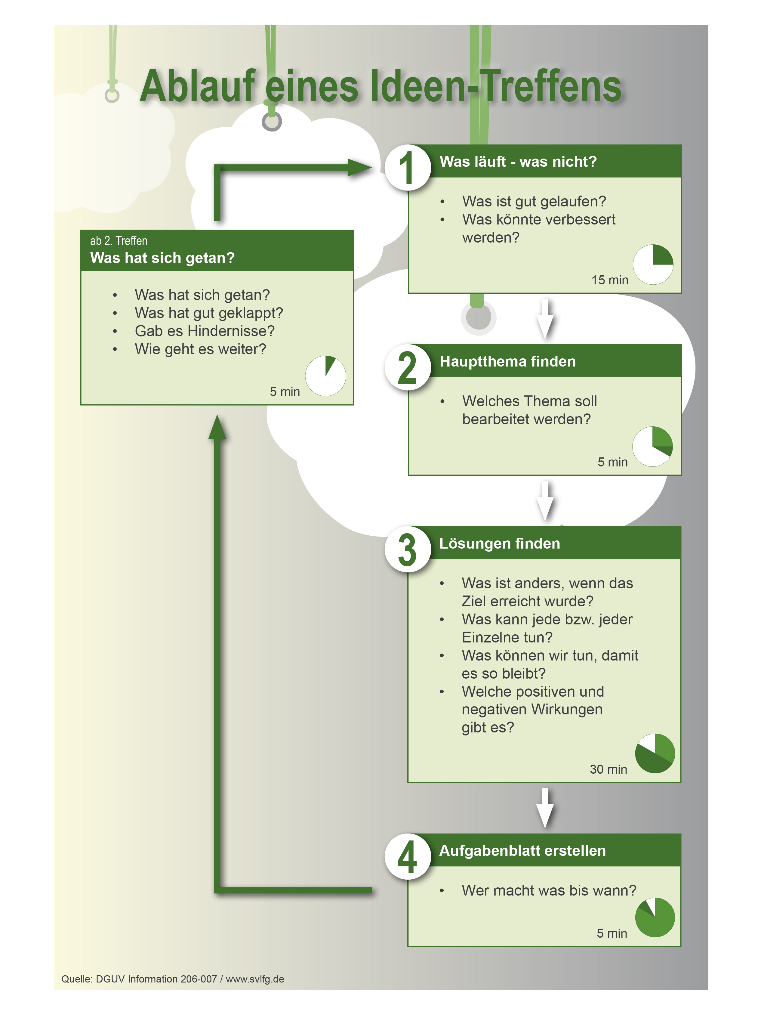 Bei einem Ideen-Treffen finden die Teilnehmerinnen und Teilnehmer heraus, welche Belastungen am jeweiligen Arbeitsplatz auftreten. Werden Fehlbelastungen festgestellt, erarbeiten alle gemeinsam Lösungsvorschläge, um diese zu verringern. Darauf aufbauend kann der Unternehmer die notwendigen Veränderungen veranlassen. So werden Belastungen bei der Arbeit verringert, Gesundheitsfaktoren am Arbeitsplatz gefördert und die Kommunikation im Betrieb verbessert. Ideen-Treffen dauern ca. eine Stunde.