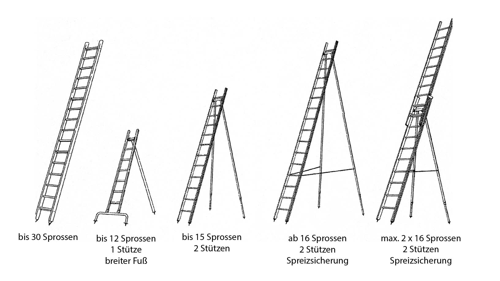 - Haben die Leitern eine ausreichende Länge (1 m länger als die zu besteigende Stelle)?