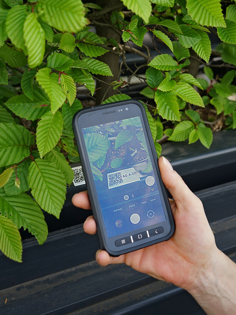Gärtnerinnen und Gärtner scannen bei Kontrollgängen die QR-Codes der Pflanzkübel. Etwaige Probleme werden mit Hilfe dieses Verfahrens unkompliziert lokalisiert und dokumentiert.