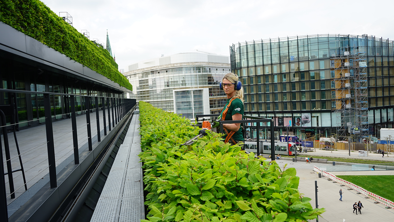 Die Pflege von Dach- und Fassadenbegrünung erfordert besondere Schutzmaßnahmen. Der Düsseldorfer KÖ-Bogen II ist ein Beispiel für vorbildlichen Arbeitsschutz unter diesen Gegebenheiten.