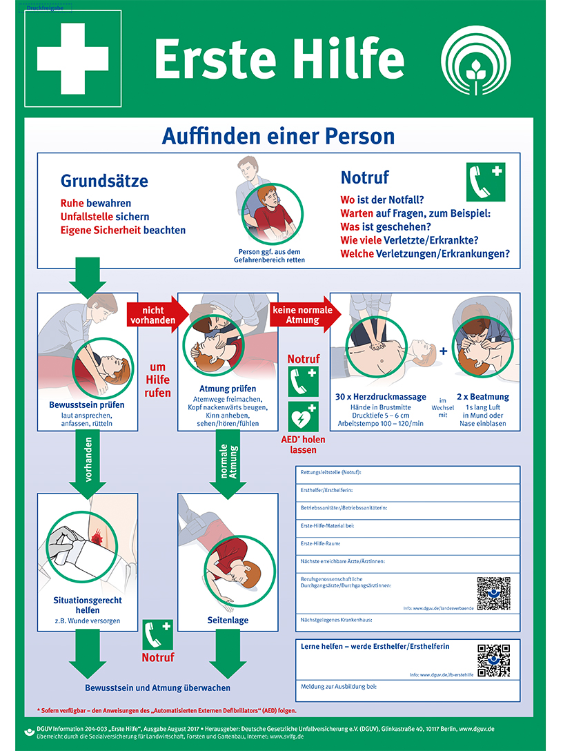 Hängen Sie das Plakat im Betrieb aus. Es zeigt den Beschäftigten, was sie im Notfall tun müssen.