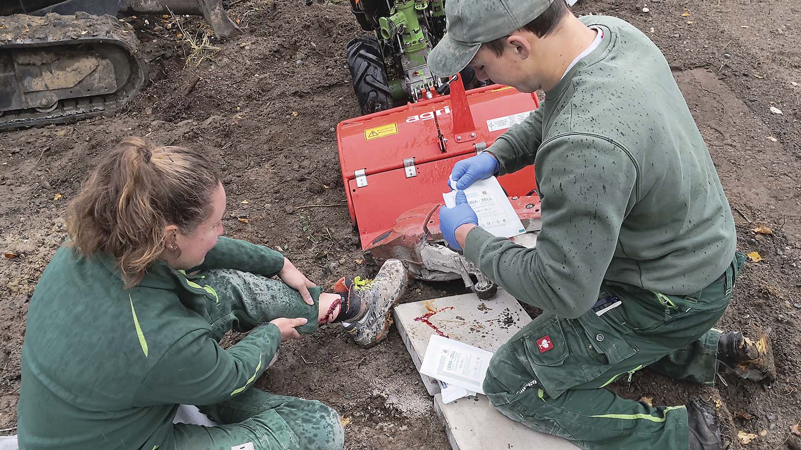 Damit der Verletzte nicht alleine gelassen wird, verbleibt der Vater an der Unfallstelle, während die Ehefrau einige Decken, eine Kältekompresse und den Verbandkasten aus dem Haus holt. Sie lässt den Verletzten an Ort und Stelle liegen und gibt ihm den Hinweis, dass er sich selbst auch möglichst nicht bewegen soll. Die Kältekompresse wird vorsichtig an die Stelle des Beines gelegt, die am meisten Schmerzen verursacht. Um das Bein in der Lage stabilisieren zu können, werden die beiden Wolldecken eingedreht und beidseitig an das betroffene Bein auf die Erde gelegt. Die neben dem Silo stehenden Werkzeugkisten werden nun von außen zur Stabilisierung an das Polstermaterial gestellt. Da der Rettungsdienst den Notfallort auf dem verwinkelten Hofgelände nicht gleich einsehen kann, geht der Vater an die Straße, um die Rettungskräfte einzuweisen. Mit der Rettungsdecke aus dem Verbandkasten wird die Wärmeerhaltung durchgeführt, allerdings ohne den Verletzten hierbei groß zu bewegen.