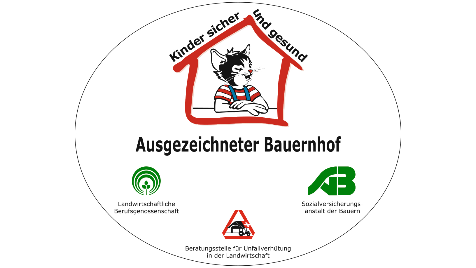 Vergrößerung des Bildes für Plakette "kinder sicher und gesund - Ausgezeichneter Bauernhof 2020" mit Kater Moritz und u.a. dem Logo der LBG.