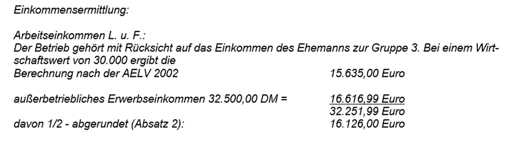 - Der Ehemann, Landwirt i. S. d. § 1 Abs. 2, hat im Jahr 1999 außerbetriebliches Erwerbseinkommen von 32.500 DM erzielt, seine Ehefrau, versichert nach § 1 Abs. 3, erzielt kein außerbetriebliches Einkommen.