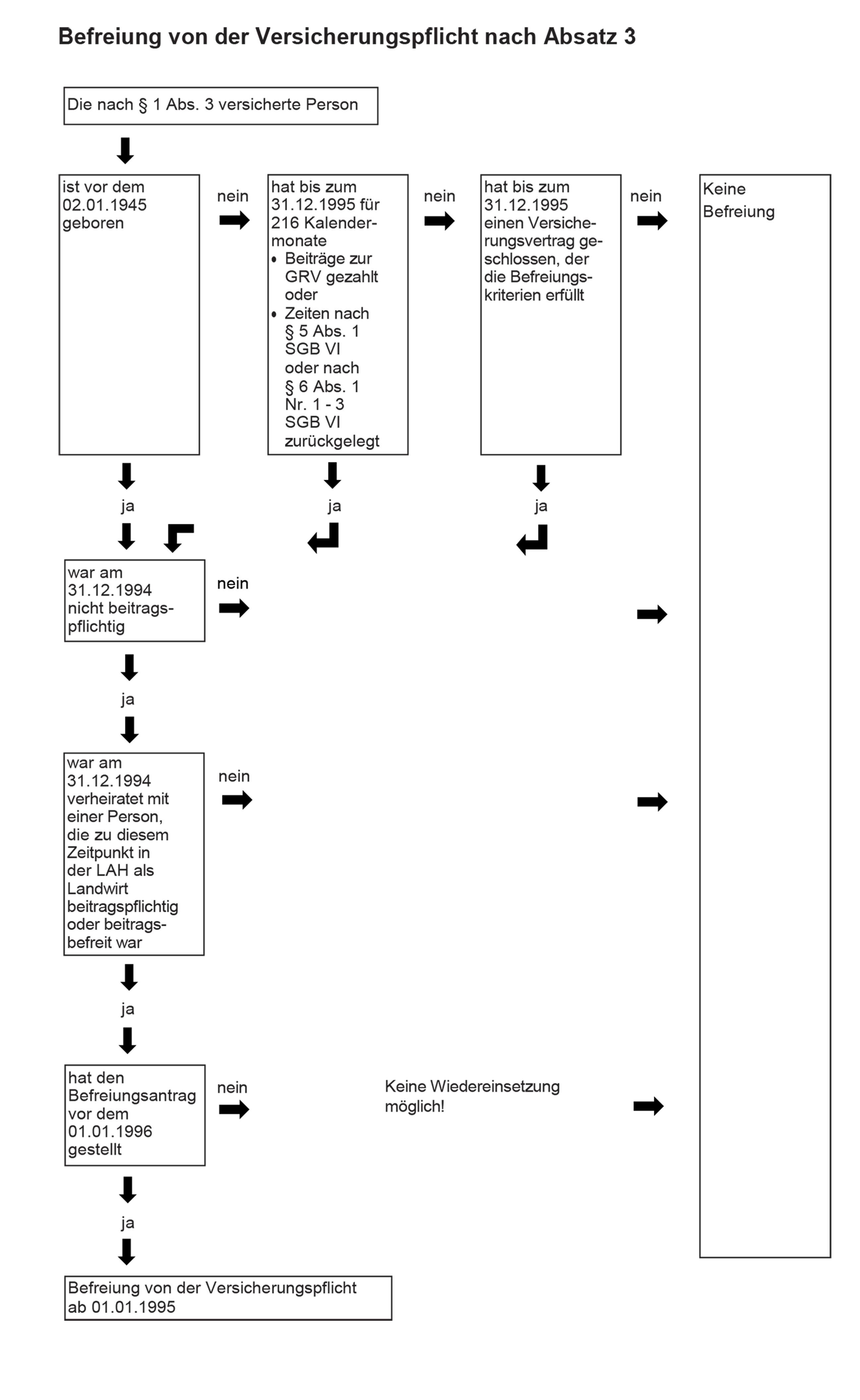Der Versicherte nach § 1 Abs. 3 muss am 31.12.1994 mit einem Landwirt verheiratet gewesen sein, der vor Inkrafttreten des ASRG 1995 nicht als Landwirt beitragspflichtig war. Ehegatten von Landwirten, die vor dem 01.01.1995 Weiterversicherungsbeiträge nach Artikel 2 § 6 Abs. 1 AHNG gezahlt haben, können sich unter den Voraussetzungen des Absatzes 3 von der Versicherungspflicht befreien lassen.