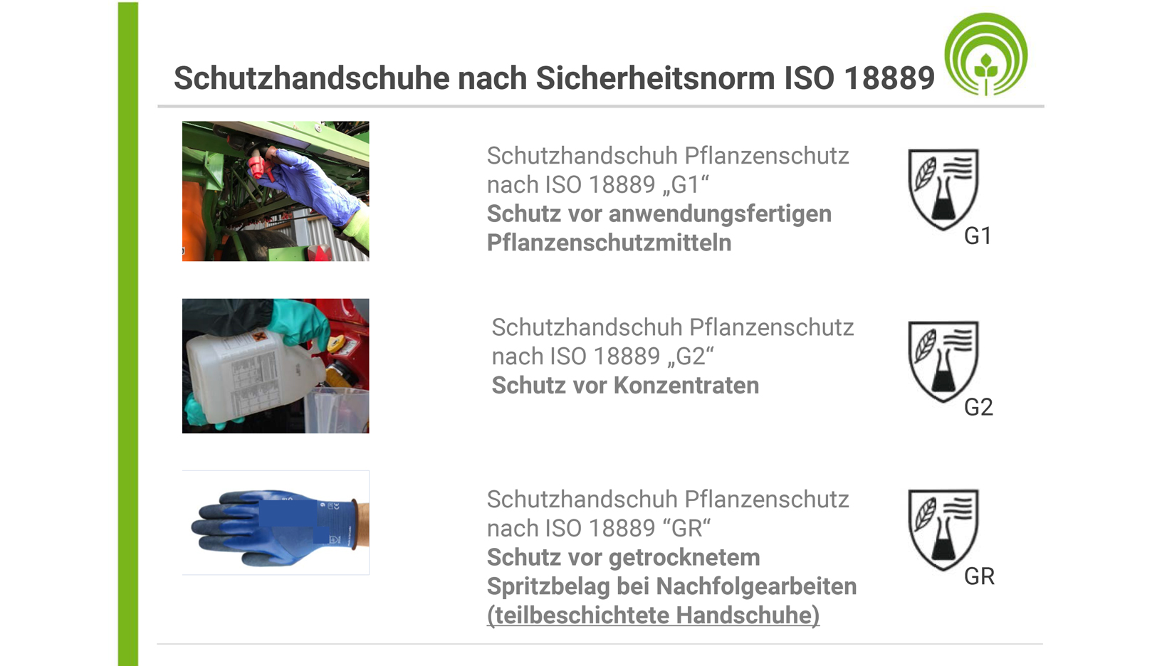 Geeignete Schutzhandschuhe werden nach der Sicherheitsnorm ISO 18889 gekennzeichnet. Diese unterscheidet drei Typen: (G = engl. Glove - Handschuh, R = engl. Re-entry - wiederbetreten)