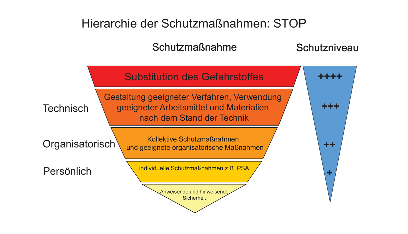 STOP steht dabei für Substitution, Technische sowie Organisatorische Schutzmaßnahmen und Persönliche Schutzmaßnahmen, wie das folgende Schema verdeutlicht.