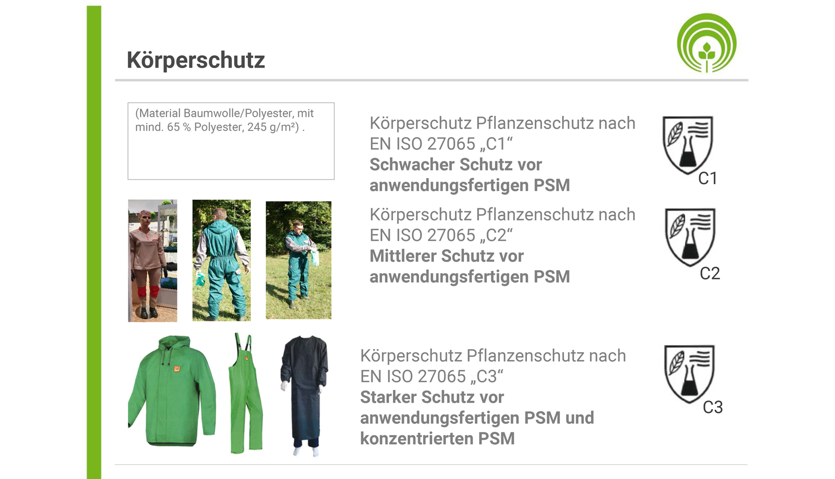 Die Anforderungen an Schutzausrüstung sind in der Richtlinie des Bundesamtes für Verbraucherschutz und Lebensmittelsicherheit (BVL) beschrieben. Diese sieht im Grundsatz immer lange Arbeitskleidung und festes Schuhwerk beim Umgang mit PSM vor. Je nach PSM und Arbeitsschritt kann weitergehende Schutzkleidung erforderlich sein.