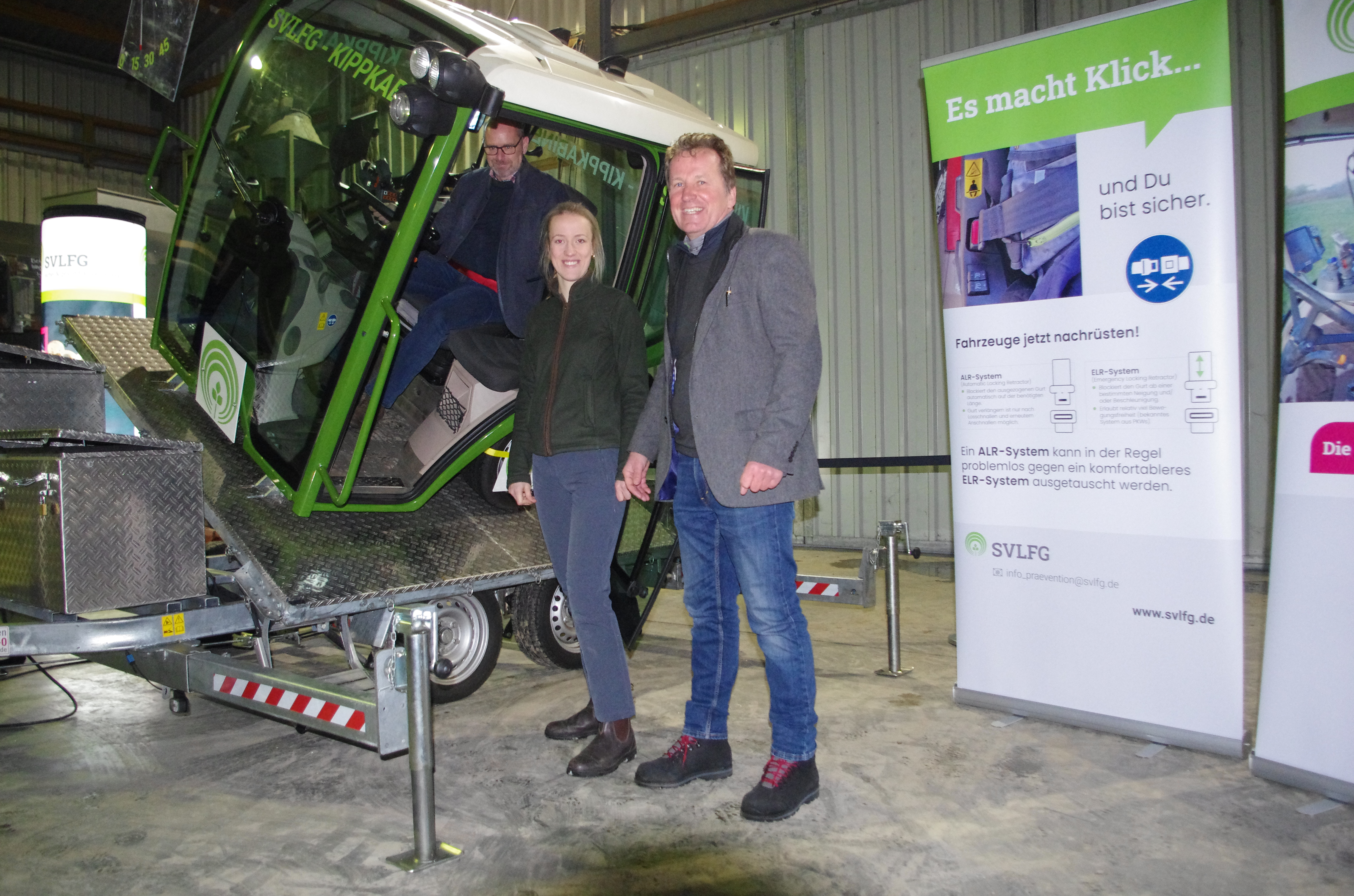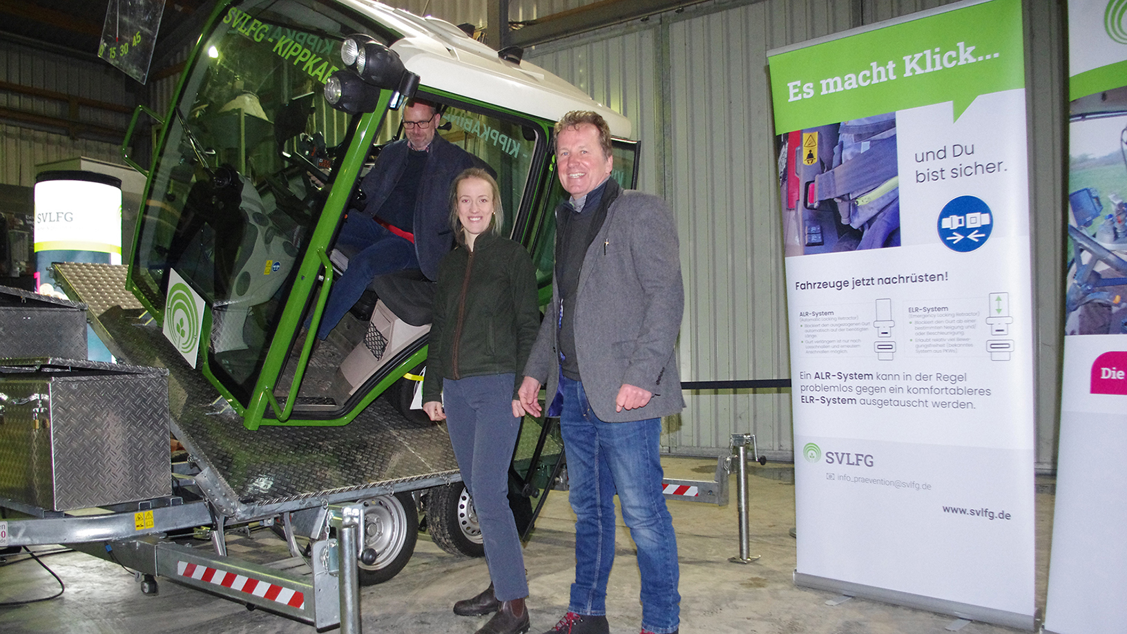 An der ersten Station der SVLFG konnten die Teilnehmenden in einem Kippsimulator das Gefühl bei einem Fahrzeugumsturz nachempfinden. Sie wurden – angeschnallt auf dem Sitz in einer Fahrerkabine – bis zu 60 Grad geneigt. So wurde allen schnell klar, dass Gurtsysteme Leben retten. Durch die an der Kabine angebrachten Rückfahrkamera mit Personenerkennung wurde deutlich, welche Bereiche diese überwacht, die für die Fahrzeugführenden nicht direkt einsehbar sind. Das Risiko, beim Rückwärtsfahren Personen zu übersehen und zu erfassen, wird dadurch deutlich reduziert.