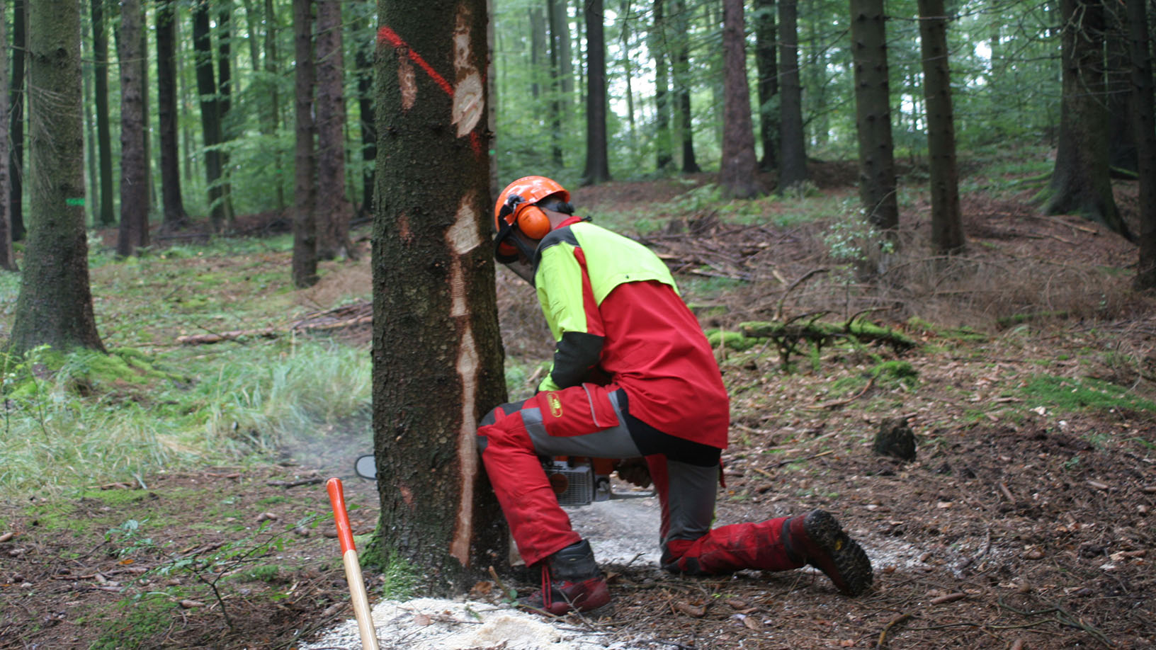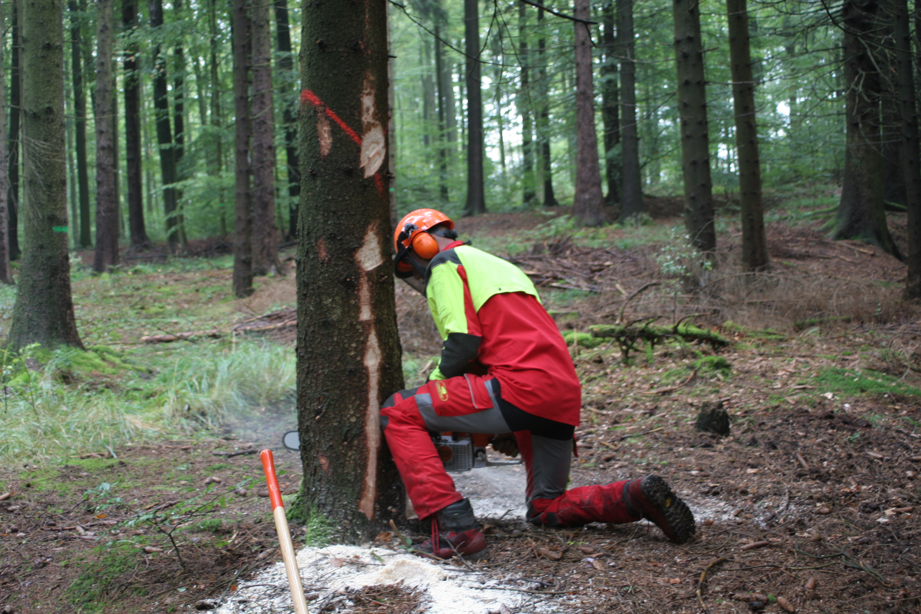 Nach dem Wortlaut der Unfallverhütungsvorschrift Forsten (VSG 4.3) darf mit den Fällarbeiten erst begonnen werden, wenn sichergestellt ist, dass sich im Fallbereich nur die mit dem Fällen beschäftigten Personen aufhalten. SVLFG und DGUV haben sich abgestimmt, wie diese Regelung genau zu verstehen ist. Sie kamen darin überein, dass die Baumbeurteilung, das Anlegen der Rückweiche und das Freimachen des Arbeitsplatzes sowie ggf. bei gesunden Bäumen das Beschneiden von Wurzelanläufen bereits zur Fällarbeit gehören, jedoch unbeteiligte Personen dabei in der Regel nicht gefährdet sind.