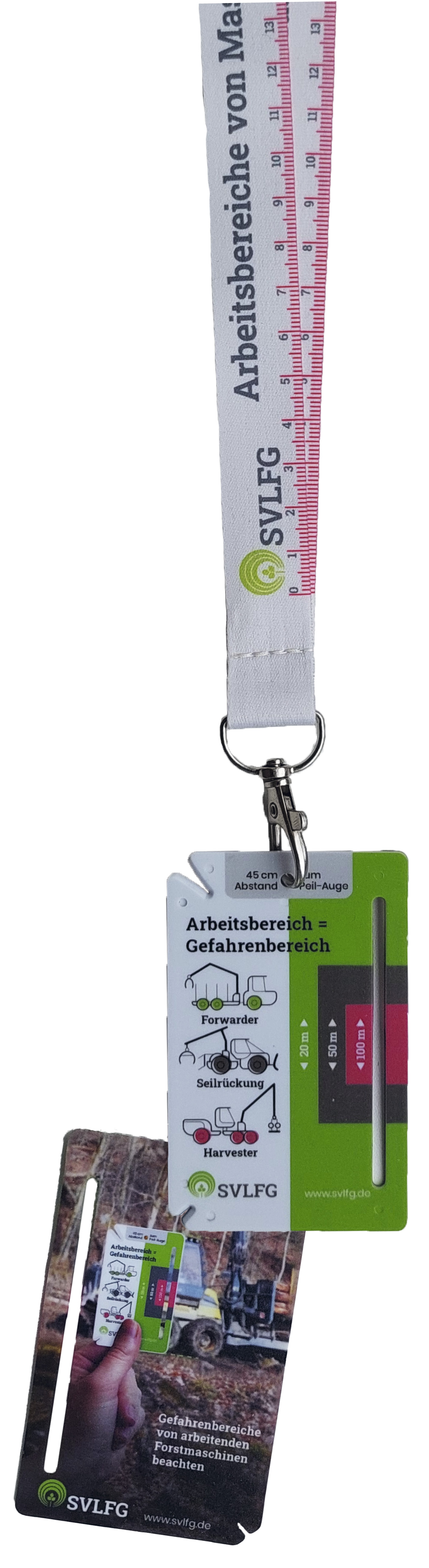 Wer den Sicherheitsabstand zu einer Forstmaschine nicht einhält, begibt sich in Gefahr. Die Abstandskarte der SVLFG hilft dabei, den erforderlichen Sicherheitsabstand zu Harvester, Forwarder oder Seilschlepper einzuschätzen. Dazu wird die Karte in einem Abstand von 45 cm (Länge des daran befestigten Schlüsselbandes) vor das Auge gehalten, welches die Maschine fokussiert. Ist das entsprechende Farbfeld auf der Karte größer und deckt die Maschine ab, passt der Abstand. Erscheint die Maschine größer als das Farbfeld, befindet sich die Person im Gefahrenbereich.