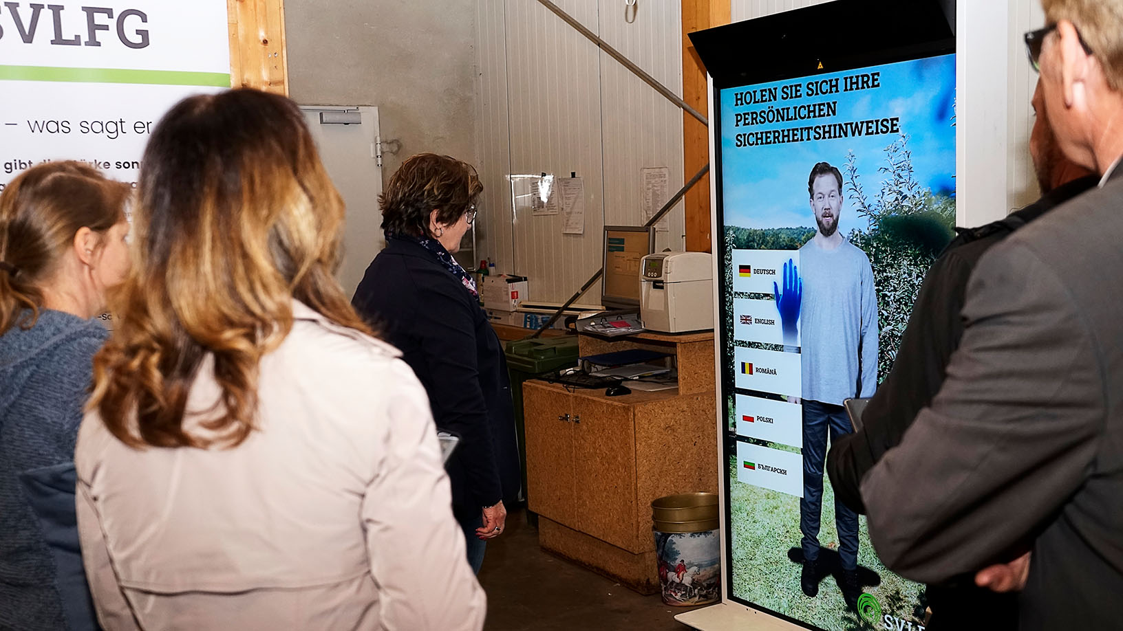 „Es wird deutschlandweit auf wechselnden Betrieben eingesetzt. Aufgebaut zum Beispiel im Pausenraum, macht es durch Gesten und Ansprache auf sich aufmerksam. Die integrierten Medien, wie Filme, Symbole und Textbausteine, und die Menüführung sind in Deutsch, Rumänisch, Polnisch, Bulgarisch und Englisch konzipiert. So vermeiden wir Sprachbarrieren“, erklärte Ingo Steitz, Mitglied des Vorstandes der SVLFG. Gemeinsam mit Gerhard Sehnert, Vorsitzender der Geschäftsführung der SVLFG, besuchte er den Betrieb in Heusweiler, um Erfahrungen auszutauschen.
