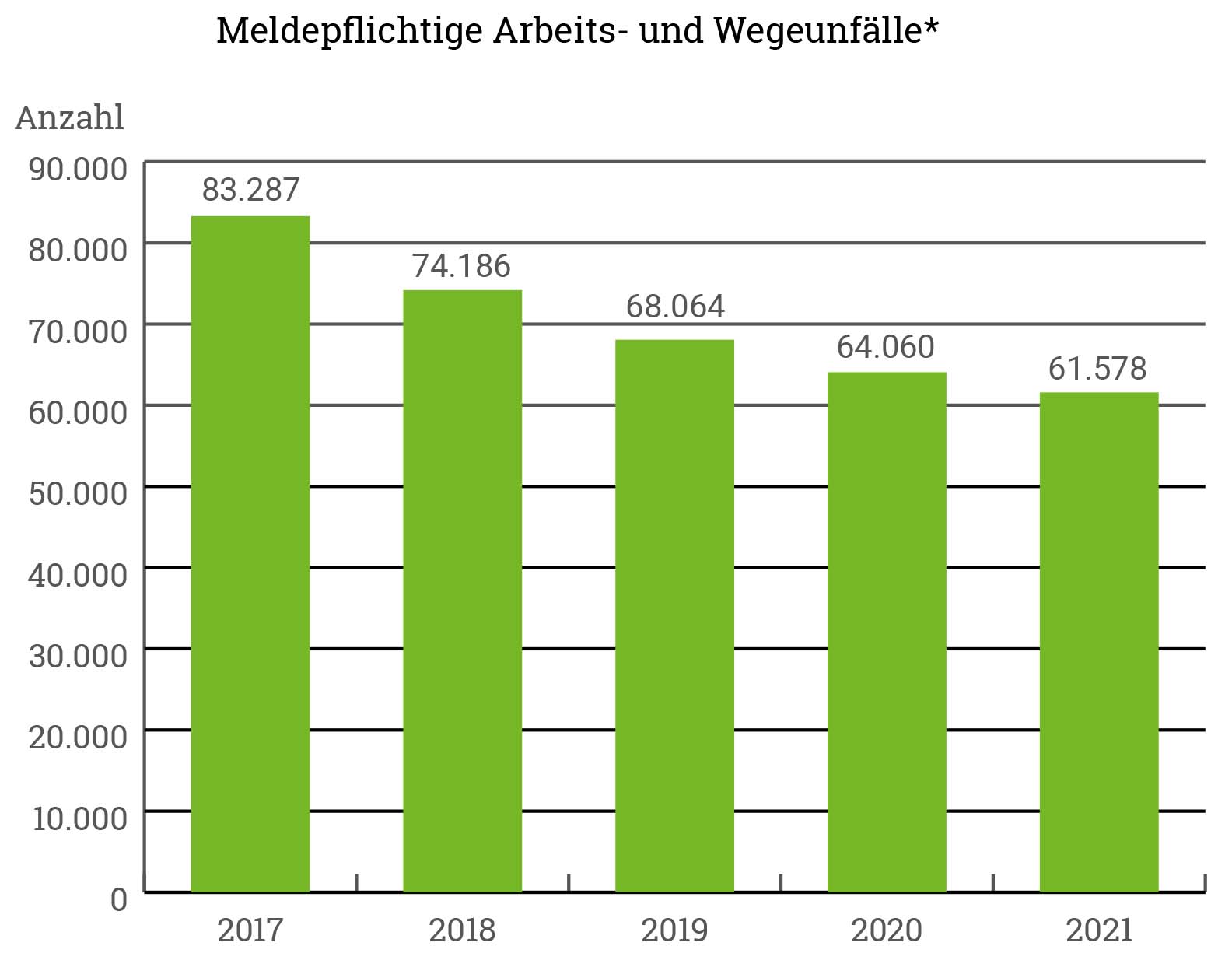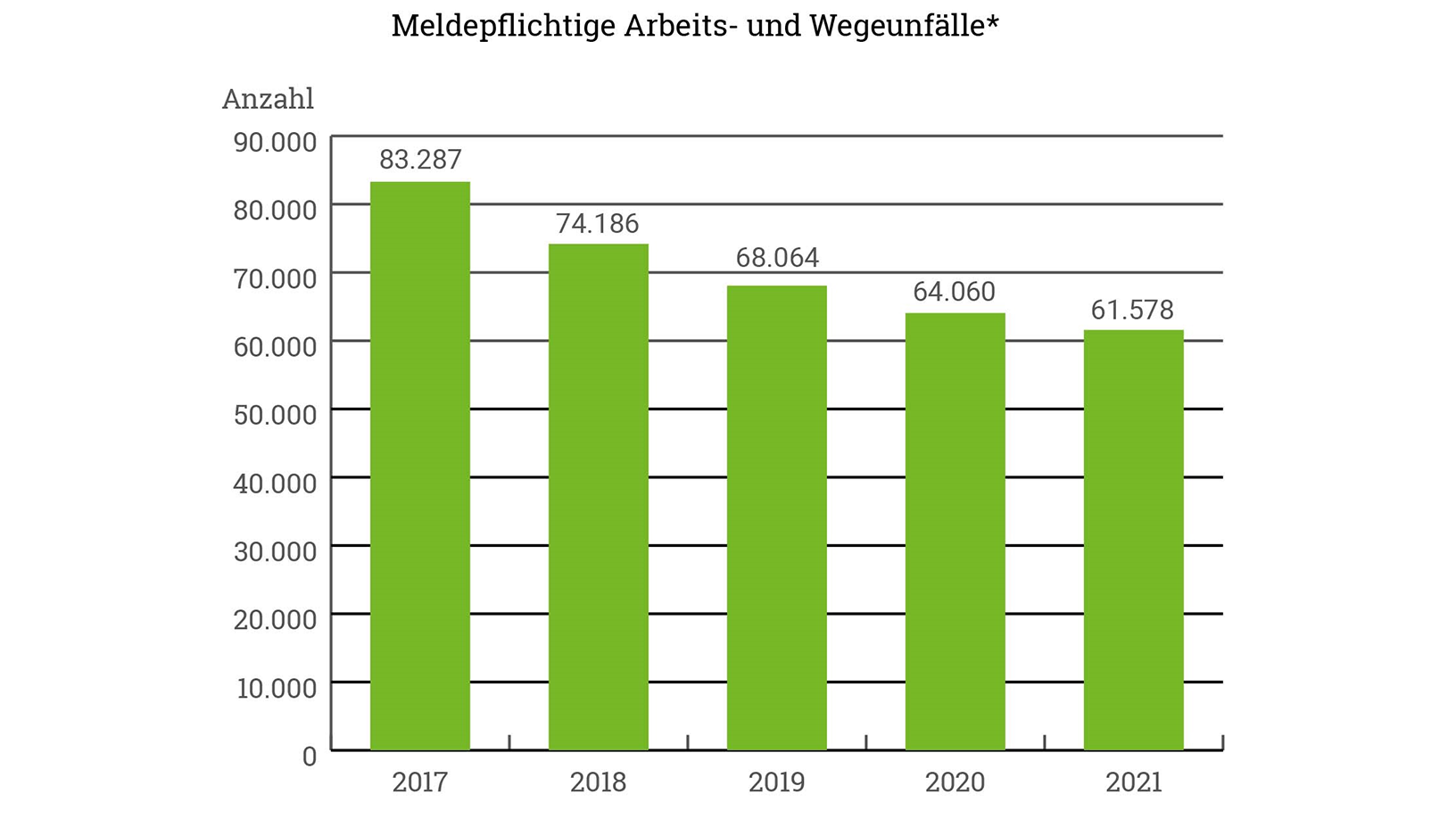 Die Zahl der neu bewilligten Unfallrenten hat sich im Vergleich zum Jahr 2020 leicht verändert. Sie lag 2021 bei 1.395 (2020: 1.384). Der Rückgang bei den Unfallrenten zeigt, dass die Zahl der schweren Unfälle mit langfristigen Folgen rückläufig ist.