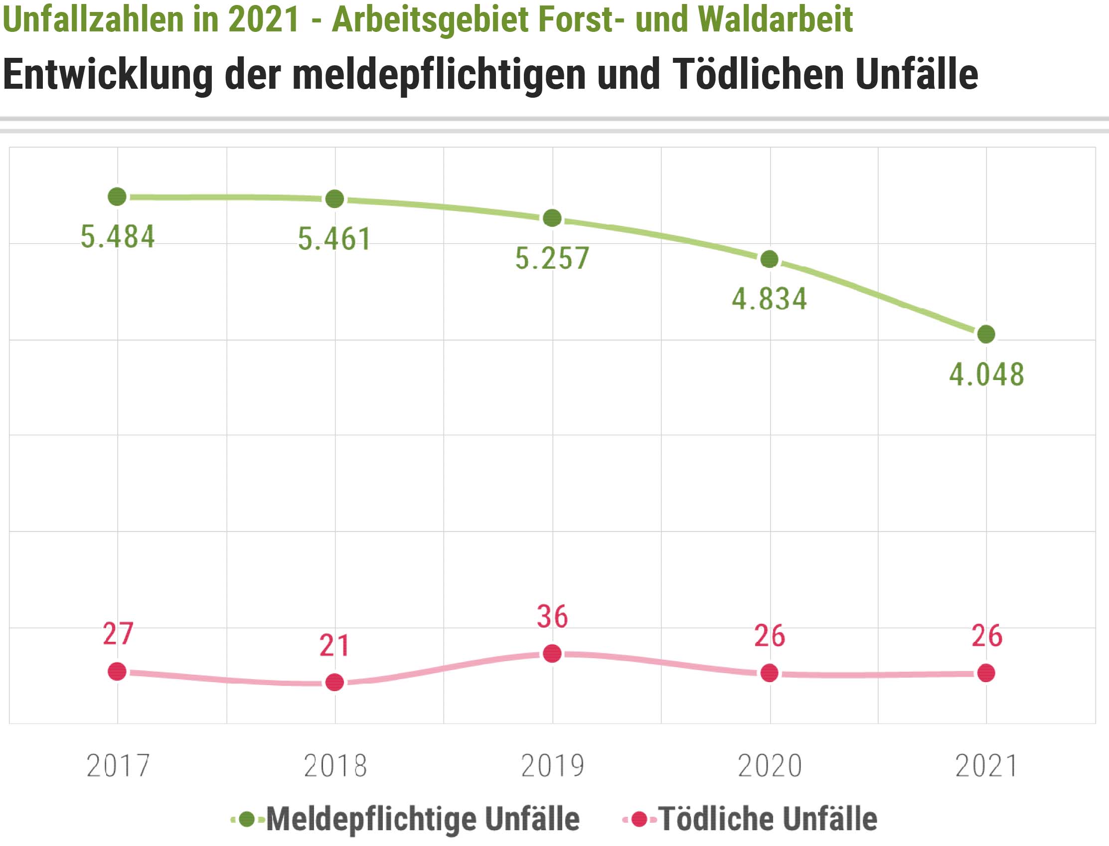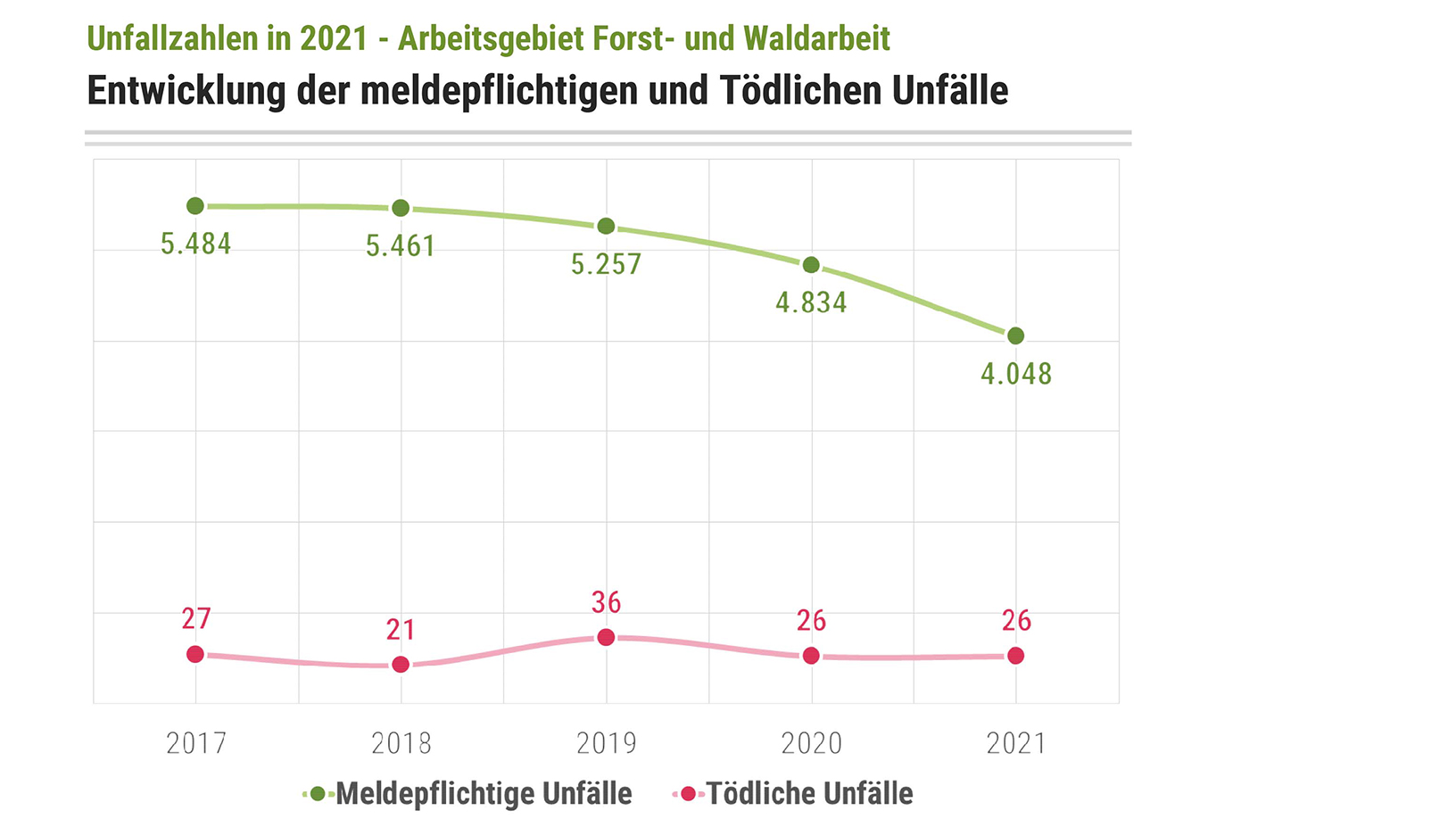 Insgesamt verzeichnete die SVLFG in Landwirtschaft, Forsten und Gartenbau für 2021 einen Rückgang der Unfallzahlen auf 61.578 Unfälle (2020: 64.060). Gestiegen ist jedoch die Zahl der Unfalltoten. 125 Personen verloren ihr Leben bei der Arbeit oder auf dem Weg dorthin (2020: 113).