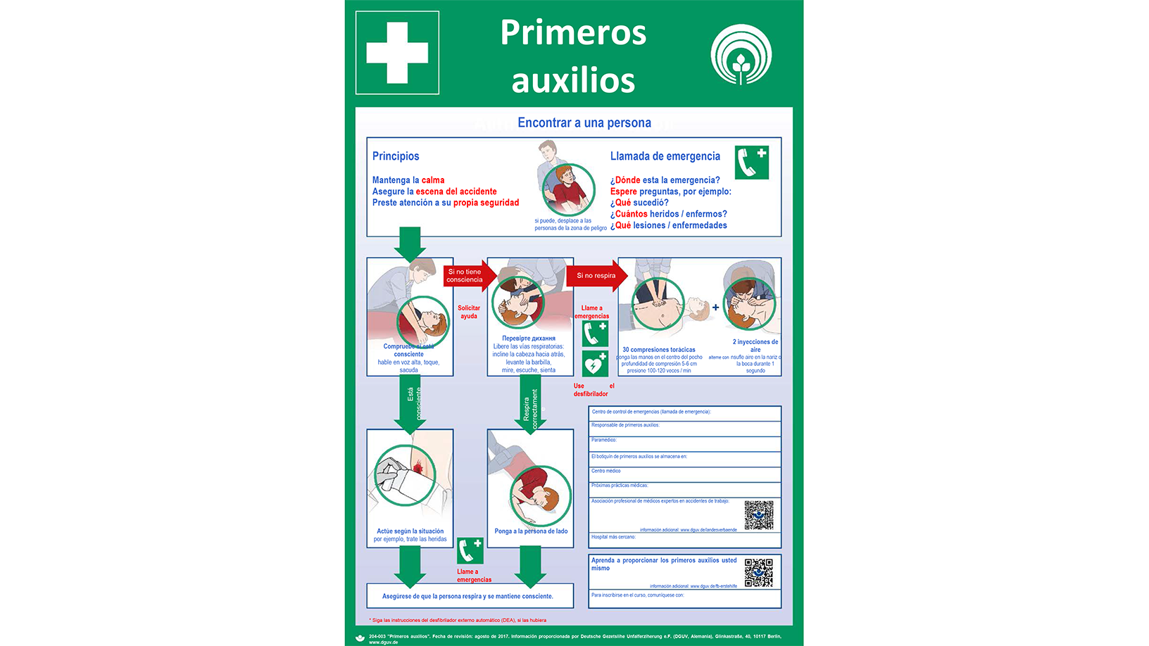 Son empleados de la empresa que tienen buenos conocimientos en primeros auxilios. Estos empleados han superado un cursillo de primeros auxilios. Cada empresa necesita tener responsables de primeros auxilios. Pregunte a su capataz o jefe quiénes son las personas en cuestión. En caso de emergencia se debe avisar inmediatamente al responsable de primeros auxilios.