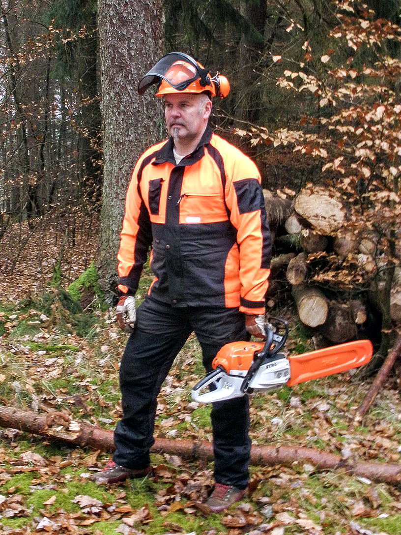 Verwendung von Schutzausrüstung: Beim Einsatz der Motorsäge ist persönliche Schutzausrüstung (PSA) Pflicht, bestehend aus: